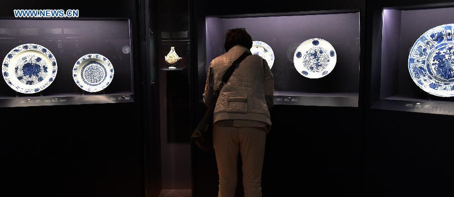 A woman visits an exhibition of porcelain plates of ancient China's Ming and Qing dynasties at the National Museum of Ancient Art in Lisbon, capital of Portugal, May 9, 2015. The exhibition of 60 exquisite Chinese porcelain plates will be closed on May 24. (Xinhua/Zhang Liyun)