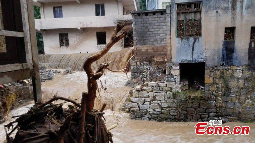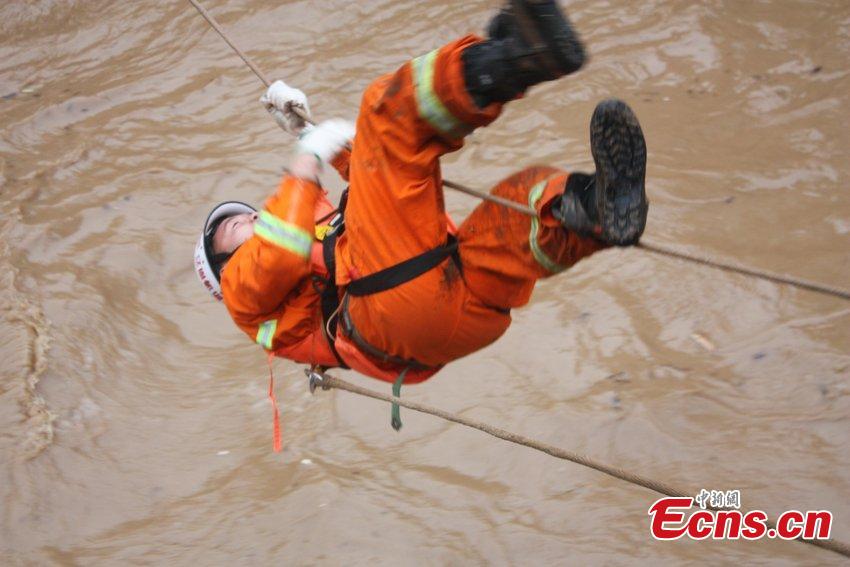 A rescuer crosses a torrent with a rope to help evacuate residents affected by flooding after heavy rain in Zhenxiong county, Southwest China’s Yunnan province, May 11, 2015. A river overflowed and flood waters affected about 3,600 residents. (Photo/CFP)