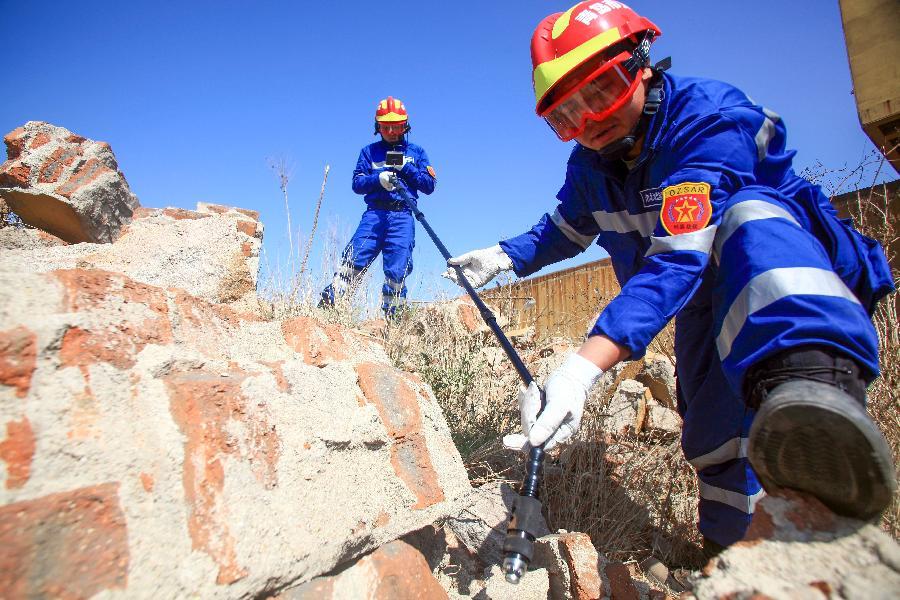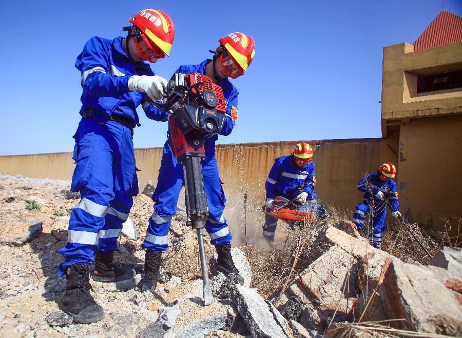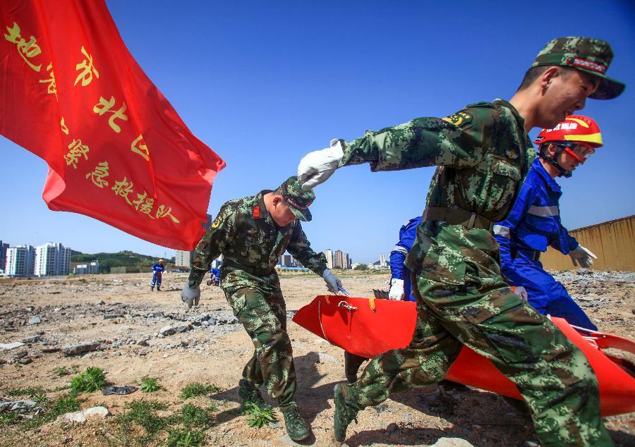 Rescuers carry a mock victim during an earthquake drill in Qingdao, east China's Shandong Province, May 11, 2015. (Photo: Xinhua/Wang Heng)