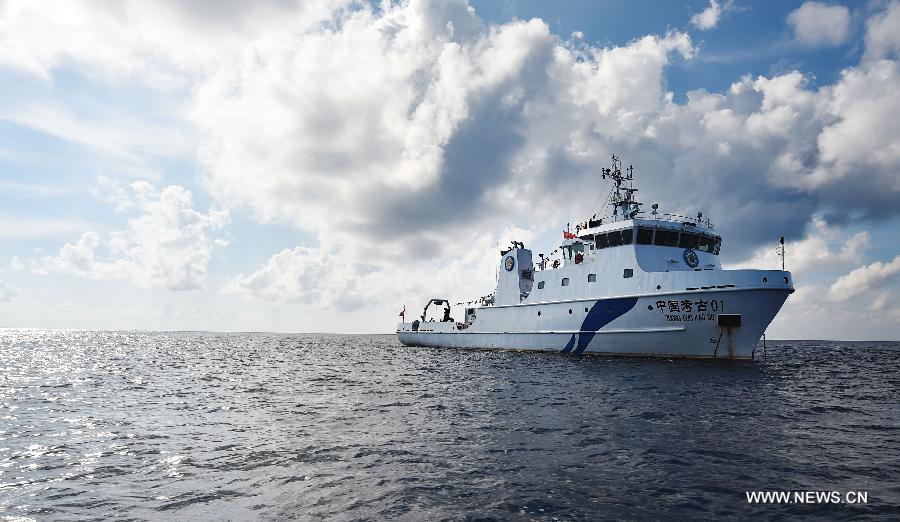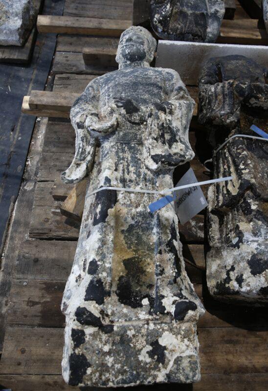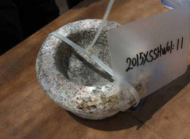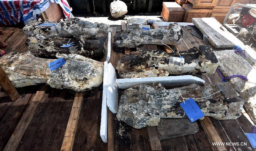 Chinese archaeologists check the sediment on a sculpture discovered near Shanhu Island in the Xisha archipelago in the South China Sea, May 13, 2015. The sites contain a substantial amount of stone building material and carvings dating back to the Qing Dynasty (1644-1911). (Photo: Xinhua/Zhao Yingquan)
