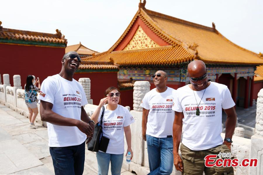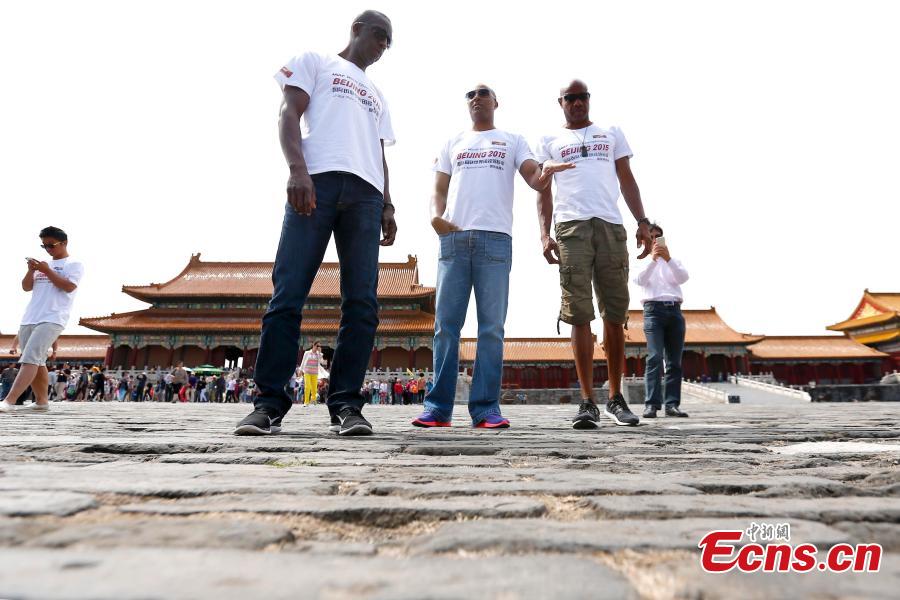 Leading athletes Colin Ray Jackson, Michael Johnson and Mike Powel visit the Forbidden City in Beijing on May 14, 2015, while marking the 100-day countdown to the IAAF World Championships Beijing 2015. The championships will run from August 22 to 30. (Photo: China News Service/Fu Tian)