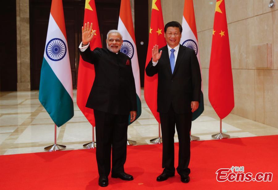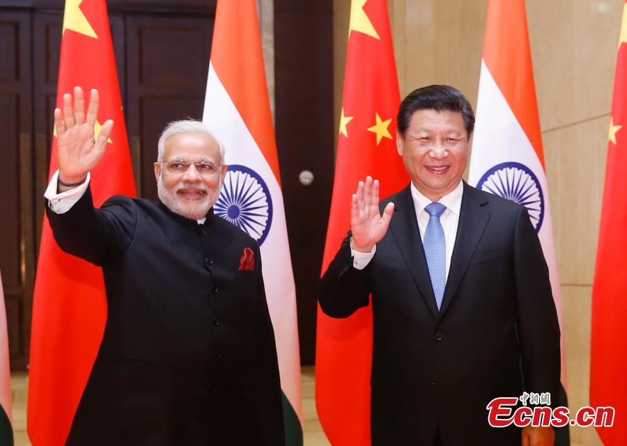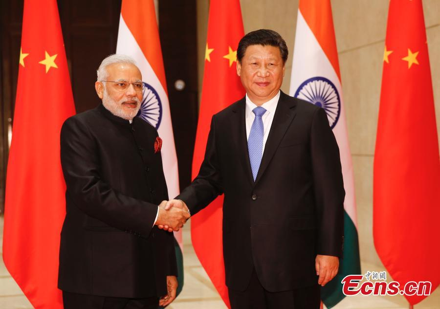Chinese President Xi Jinping (R), meets Indian Prime Minister Narendra Modi on Thursday, May 14, 2015 in Xi'an, capital of Northwest China's Shaanxi Province. Thursday is the first day of Modi's three-day visit to China. (Photo: China News Service/ Du Yang)