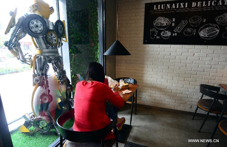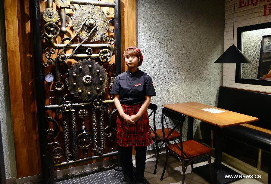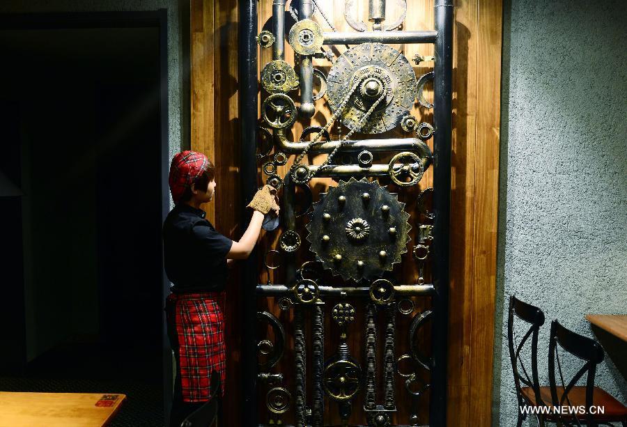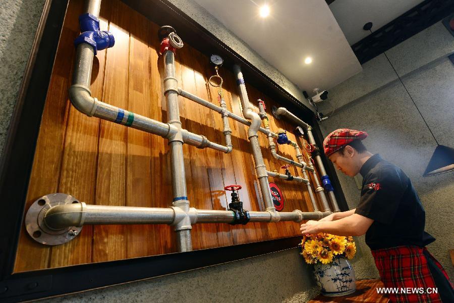 A waiter tidy up the table at a theme restaurant in Jinan, east China's Shandong Province, May 14, 2015. A theme restaurant decorated with pipeline, axle and other elements of factory opened in Jinan and attracted many young customers. (Photo: Xinhua/Zhao Xiaoming)