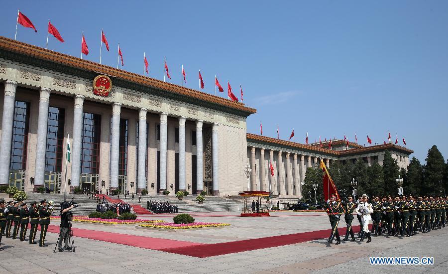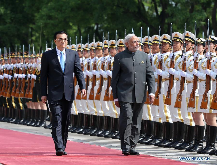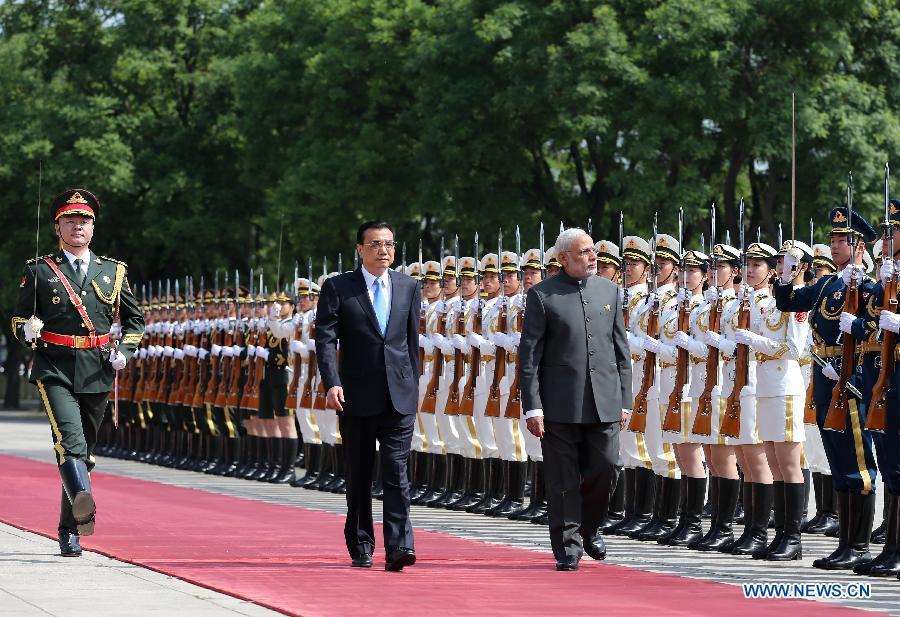 Chinese Premier Li Keqiang (2nd L) holds a welcoming ceremony for Indian Prime Minister Narendra Modi before their talks in Beijing, capital of China, May 15, 2015. (Xinhua/Pang Xinglei)