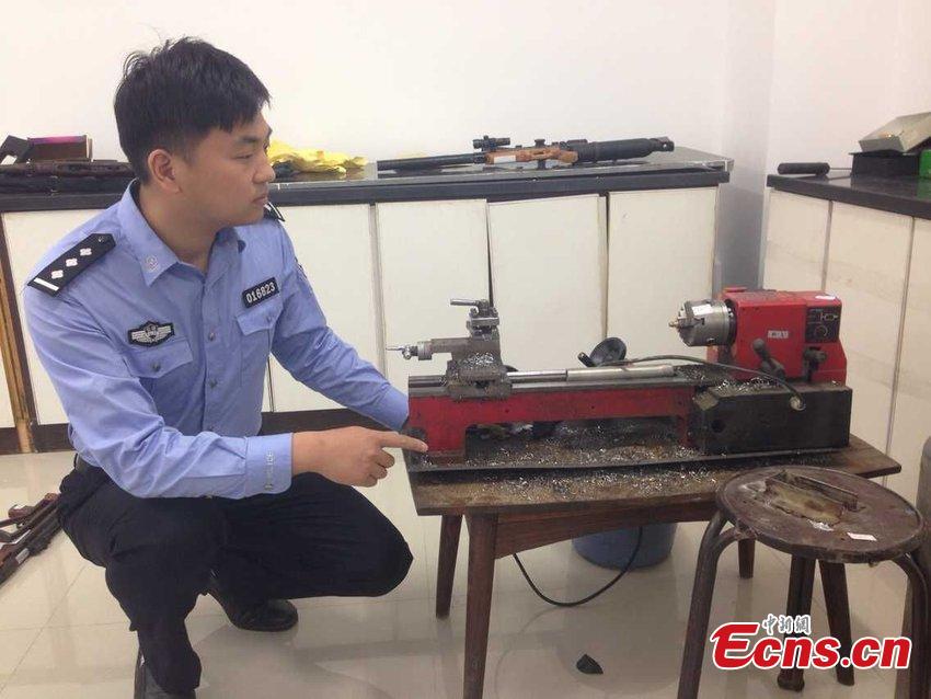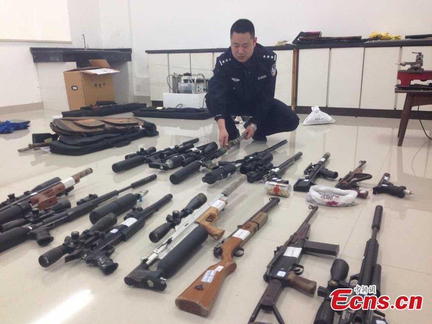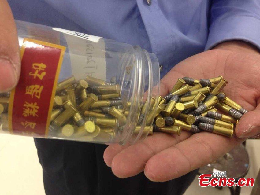 A policeman displays homemade guns and bullets after busting a crime ring in Wuhe county of Bengbu city, East China’s Anhui province, May 13, 2015. Local police captured 13 suspects and seized 22 guns, over 6,000 bullets, and equipment to make the weapons. The main suspect, who works in crane renting and has a stable income, was interested in hunting and learned about gun making from the Internet years ago. (Photo/CFP)