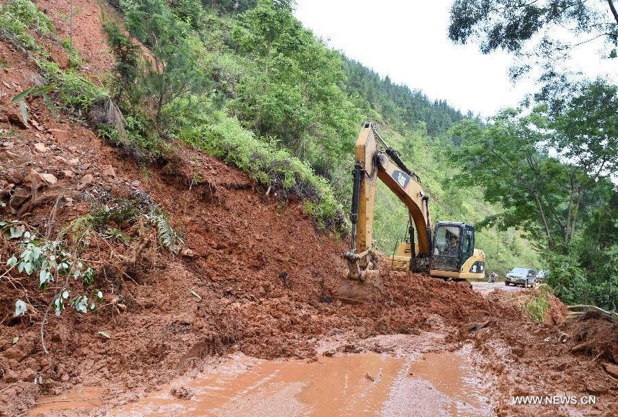 A resident collects items at her destroyed house in Sanfang Township of Rongshui County, south China's Guangxi Zhuang Autonomous Region, May 16, 2015. Downpours battered south China on Saturday, damaging houses, disrupting traffic and killing at least four people. The civil affairs department of Guangxi estimated that about 170,000 people in 20 counties were severely affected by the downpours and rain-triggered floods. (Photo: Xinhua/Li Bin)