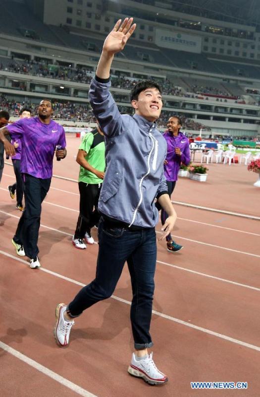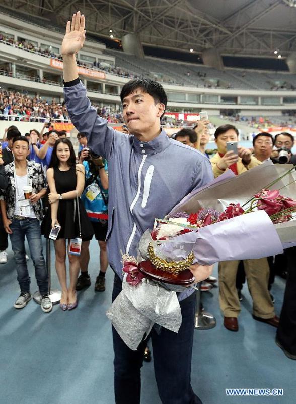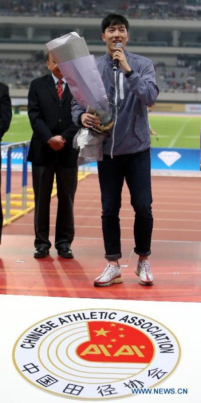 Former Chinese hurdler Liu Xiang, who retired last month, makes an emotional speech with tears in his eyes during his farewell ceremony after the Diamond League meeting in Shanghai, east China, on May 17, 2015. (Photo: Xinhua/Fan Jun)