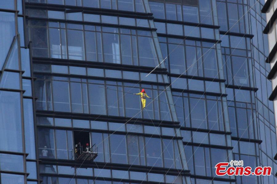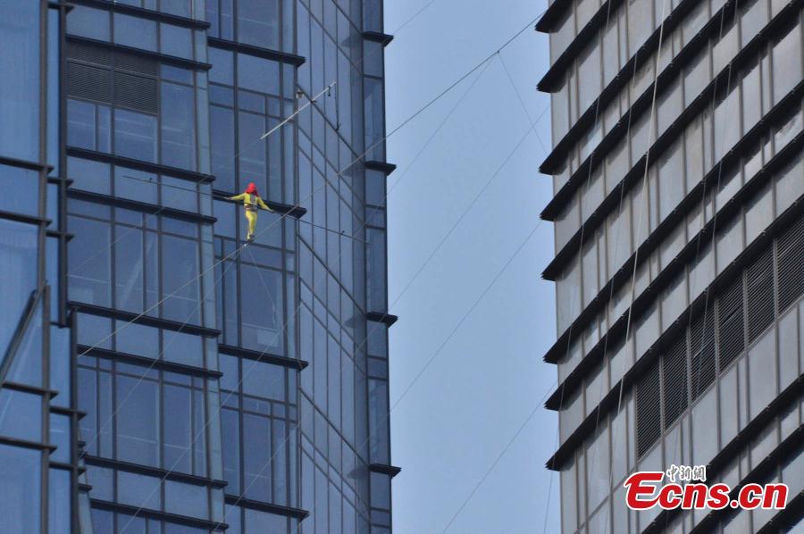 Aisikaier completes blindfolded tightrope walk in Yunnan(1/3)