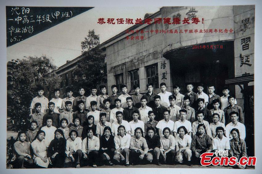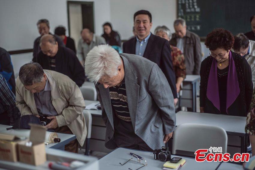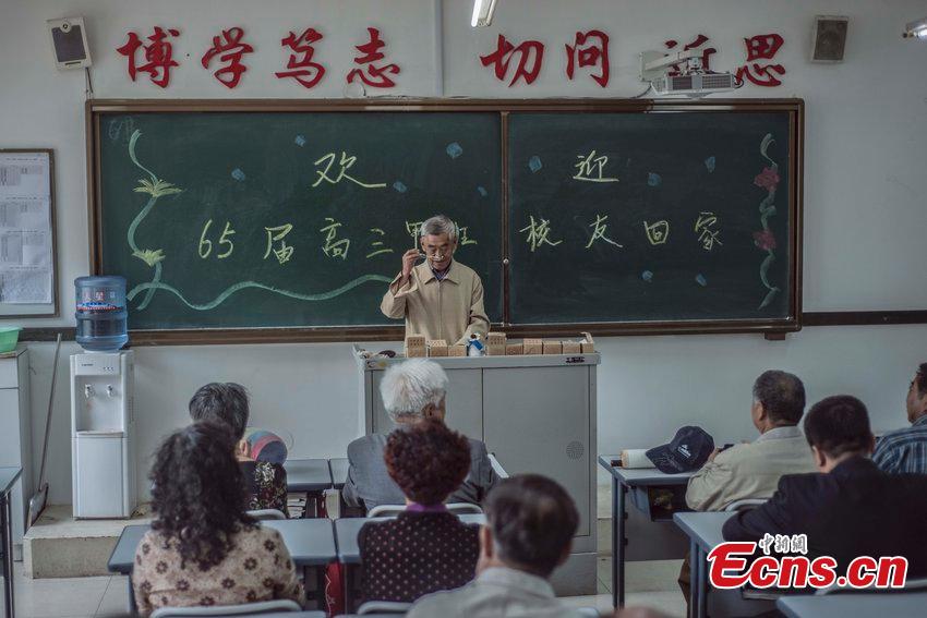 Senior citizens aged around 70 years gather at a high school in Shenyang, Northeast China’s Liaoning province, May 18, 2015. Thirty alumni and alumnae returned to the school for the 50th anniversary of their graduation, with their nearly 80-year-old former class supervisor presenting a lecture once again. (Photo/CFP)