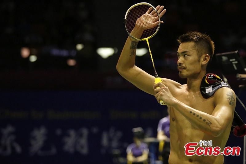 China's Lin Dan celebrates after winning the men's singles match against Japan's Takuma Ueda during the final at 2015 Sudirman Cup BWF World Mixed Team Championships in Dongguan, south China's Guangdong Province, May 17, 2015. China beat Japan by 3-0 and claimed the title of the event. (CNS photo/Han Haidan)