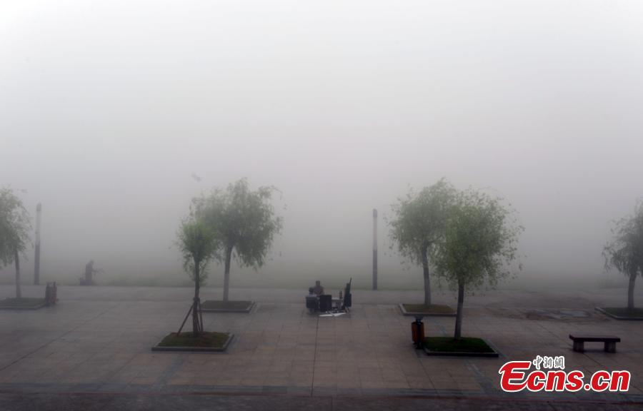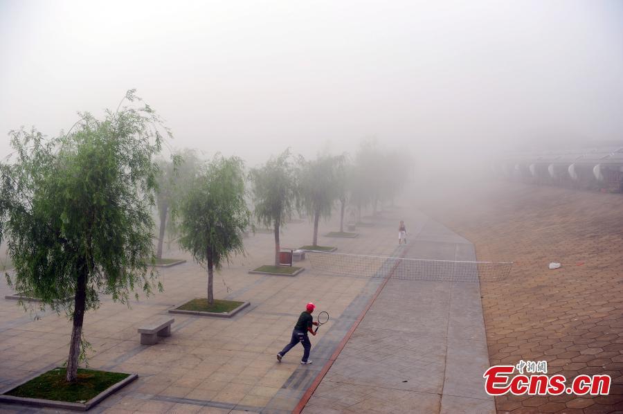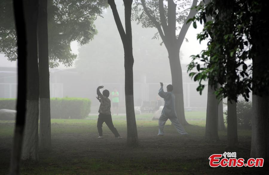 Residents exercise near the Yangtze River on a foggy day in Wuhan city, Central China’s Hubei province, May 19, 2015. The local meteorological observatory station issued a yellow alert as visibility reduced to 200 meters in some areas and traffic control was imposed on several expressways. (Photo: China News Service/Zhang Chang)
