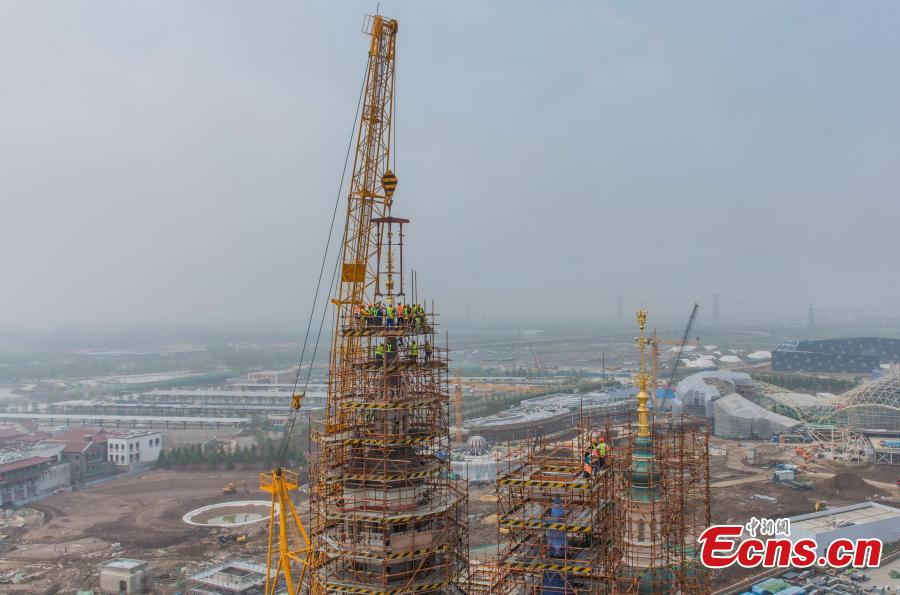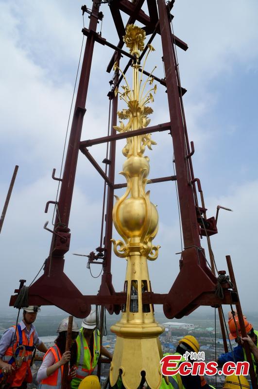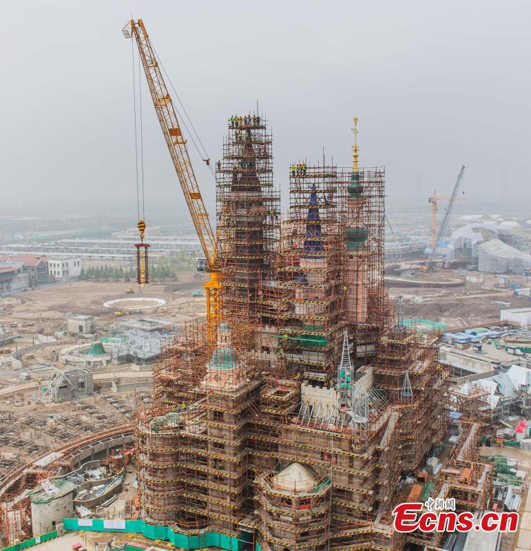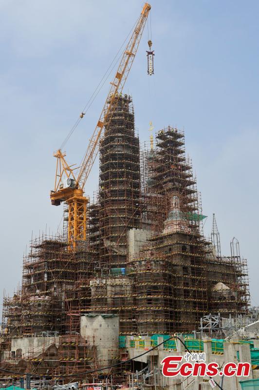 Workers put a gold-colored finial on top of a “castle” at Shanghai Disney Resort on May 19, 2015. Once completed, the building will be the largest Disney castle ever built, the theme park claimed. The park is scheduled to open to public next spring. (Photo/ Shen Hai)