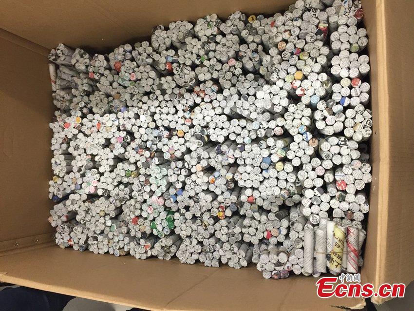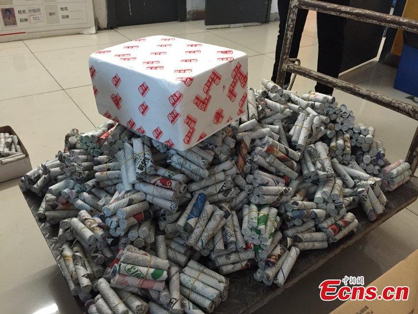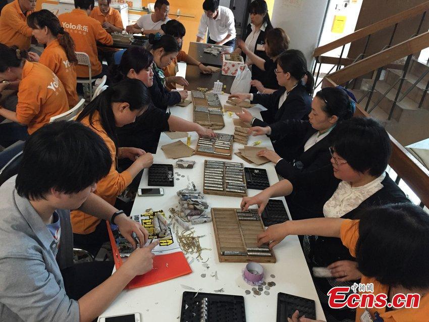 Bundles of Chinese coins are presented at a home appliance store in Shanghai, May 19, 2015. Monks from a temple in the ancient town of Fengjing brought about 200,000 one-jiao (equal to one-tenth of one yuan) coins to buy water heaters, forcing the mall to ask a bank for help to count them. (Photo/CFP)