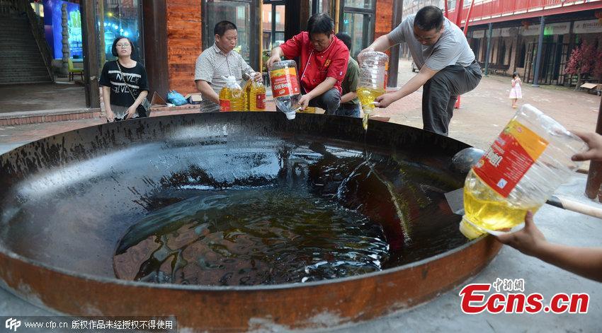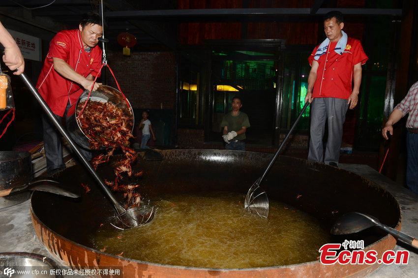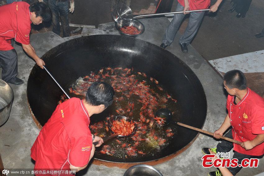 Cooks make spicy shrimp using a giant iron pot during a beer and music festival in Changsha city, capital of Central China's Hunan province, May 19, 2015. It took four cooks three hours to make 500 kg of spicy shrimp, a typical delicacy, using the iron pot, which was 3.2 meters in diameter. The mixture was heated by burning firewood, a technique said to enhance the favor. The meal was offered to residents for free. (Photo/CFP)