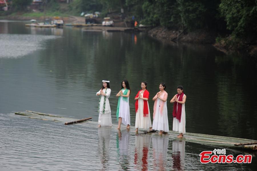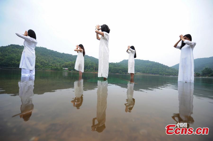 Yoga practicers demonstrate movements on a water-covered platform at a lake in Changsha city, capital of Central China's Hunan province, May 20, 2015. The event aimed to promote green lifestyle choices and harmony between nature and human beings, the organizer said. (Photo: China News Service/Yang Huafeng)