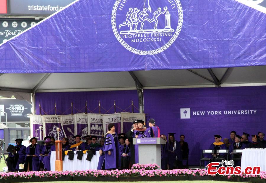 Chinese pianist Lang Lang receives an honorary doctorate presented by John Sexton, President of New York University, at NYU’s 183rd Annual All-University Commencement in Yankee Stadium in New York, May 20, 2015. The honor was in recognition of Lang Lang’s contribution to promoting classical music. (Photo: China News Service/Ruan Yulin)
