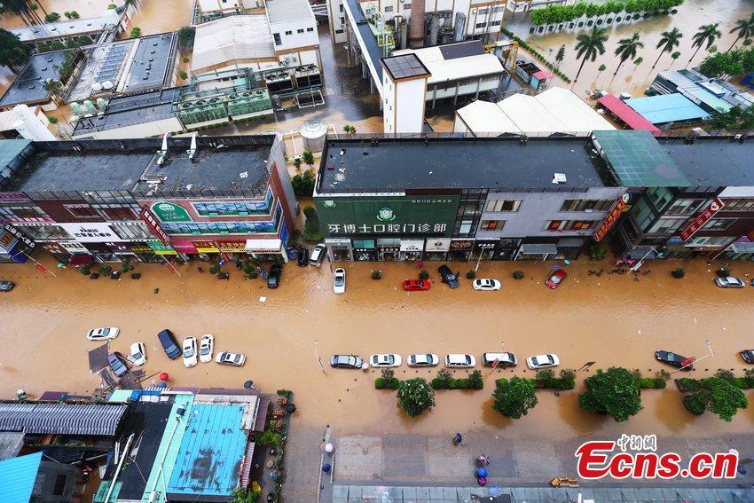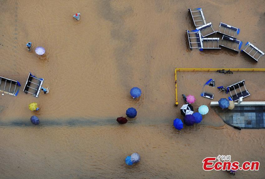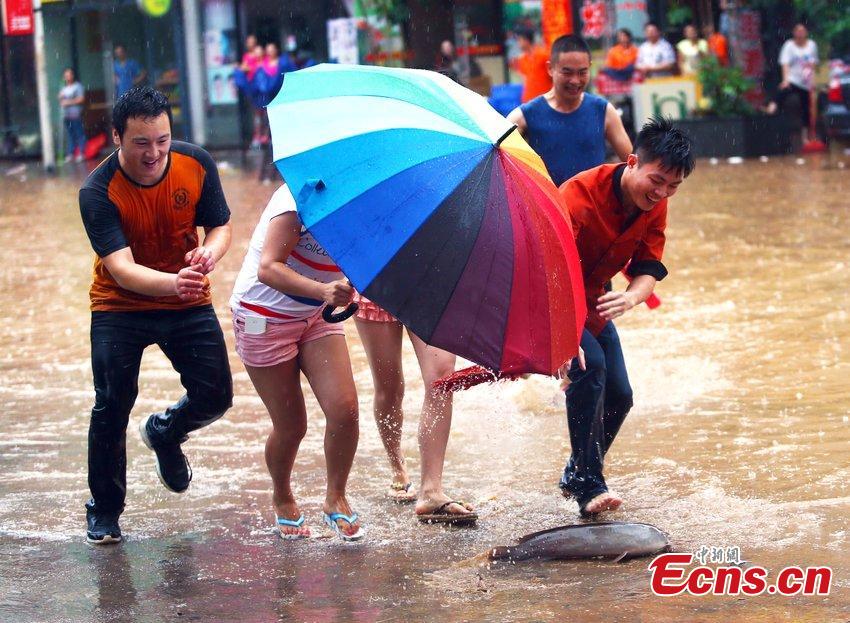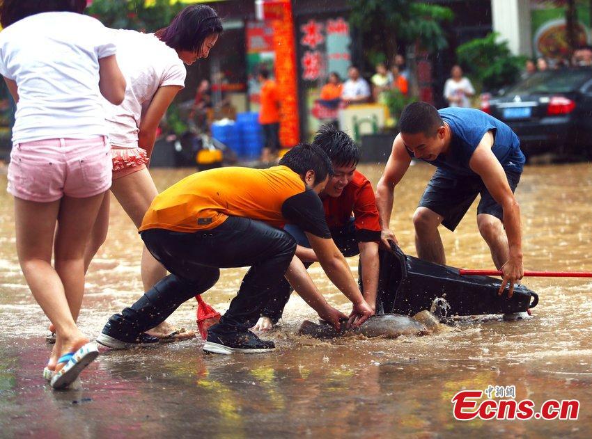 Residents catch fish on a flooded street after heavy rain in Dongguan city, South China’s Guangdong province, May 20, 2015. (Photo/CFP)