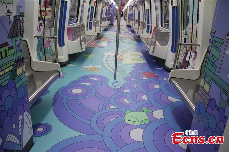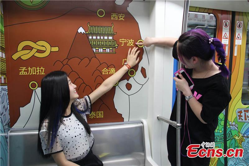A subway train themed with Maritime Silk Road culture runs in Ningbo city, East China’s Zhejiang province, May 20, 2015. The train mainly uses cartoons and paintings to illustrate the ancient voyage route that connected Ningbo with many cities in other countries. Many people have taken the train to take pictures or better understand the region's history. (Photo: China News Service/Lin Bo)