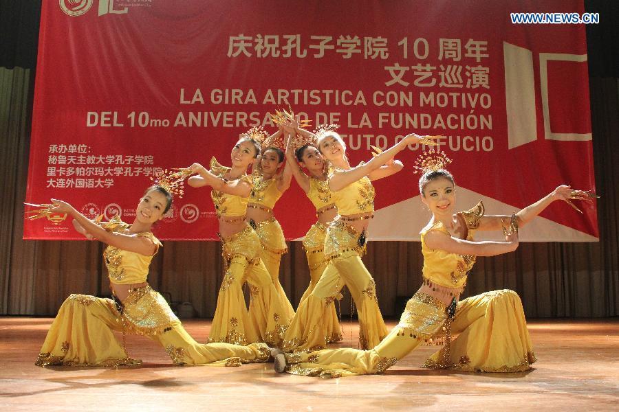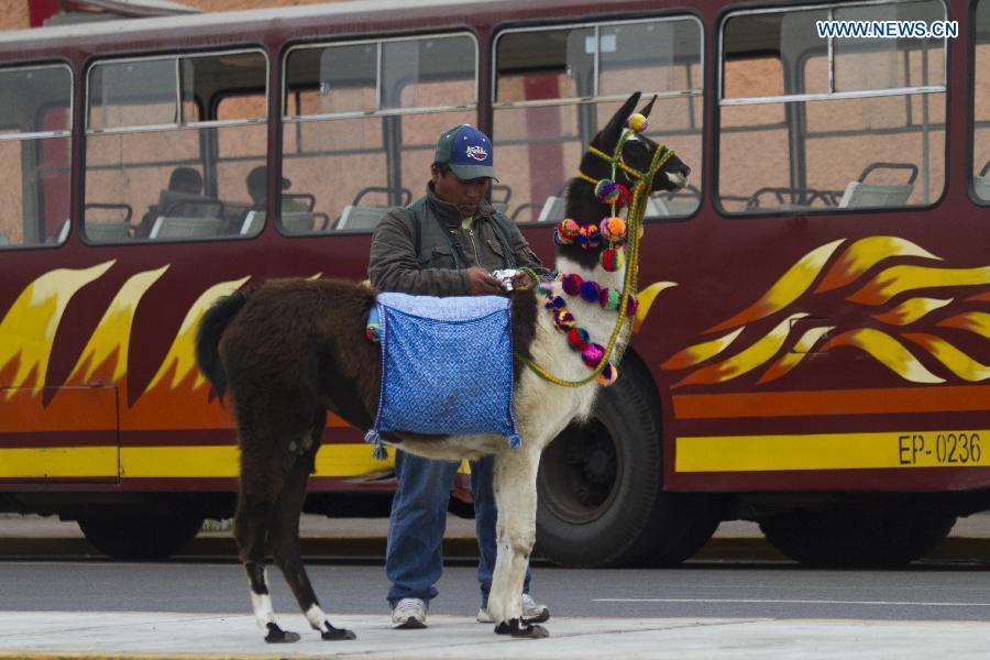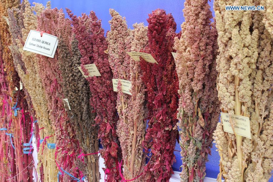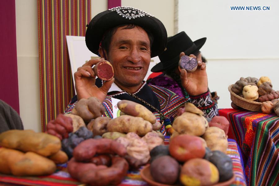 Image taken on May 30, 2013 shows a merchant displaying different types of potatoes cultivated in the Andean region during an event in Lima, capital of Peru. Chinese Premier Li Keqiang started on May 18 his South American trip including Brazil, Colombia, Peru and Chile. (Photo: Xinhua/Luis Camacho)