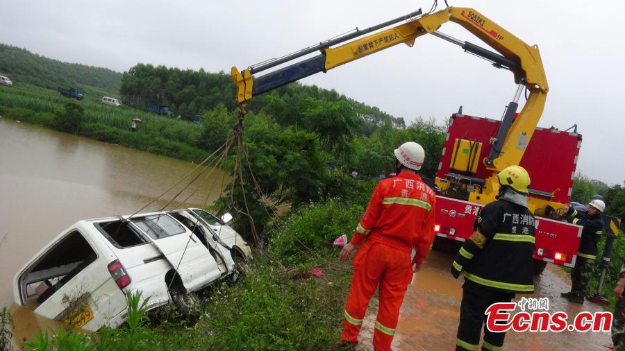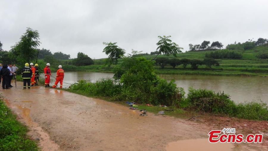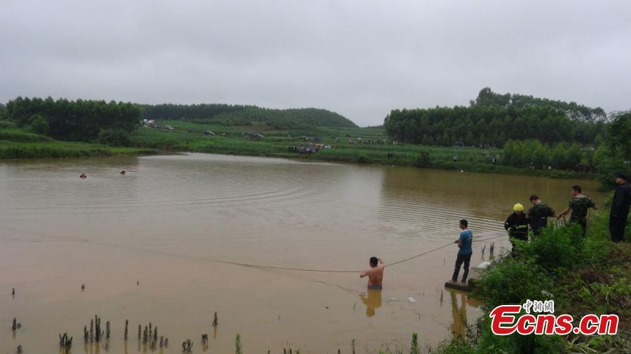 Rescuers lift a school bus out of a pond in Guiping city, Southwest China’s Guangxi Zhuang autonomous region, May 22, 2015. A bus for a kindergarten, carrying 23 children, fell into the pond, leaving two children dead. Rains hit the region recently. The accident is still under investigation. (Photo: China News Service/Wang Shi)