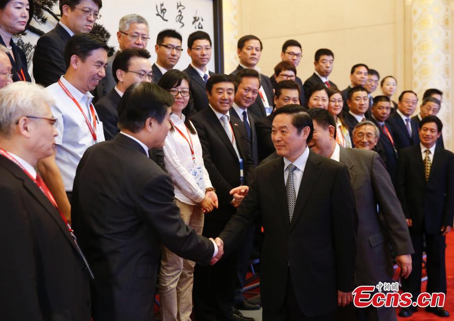 Liu Qibao, a member of the Political Bureau of the Communist Party of China (CPC) Central Committee and head of the CPC Central Committee's Publicity Department, meets with representatives of overseas Chinese media in Beijing, capital of China, May 22, 2015. (CNS photo/Du Yang)