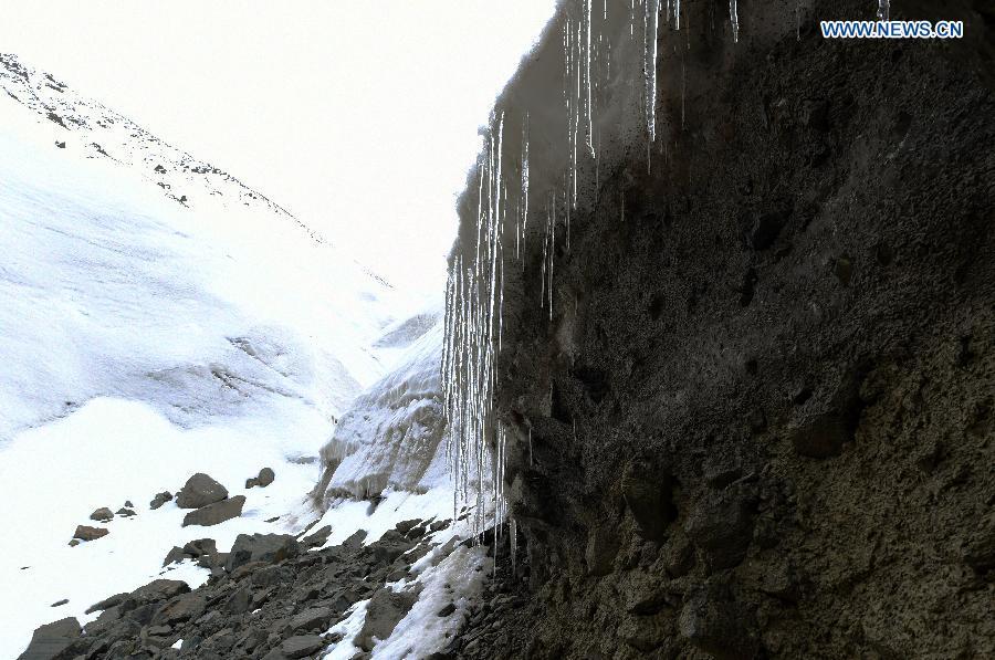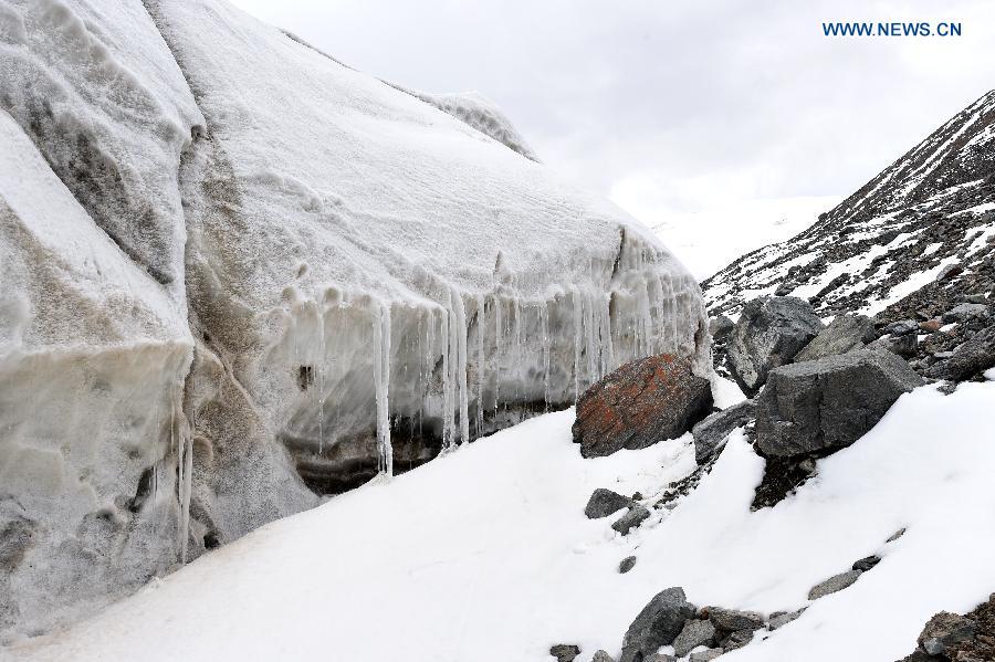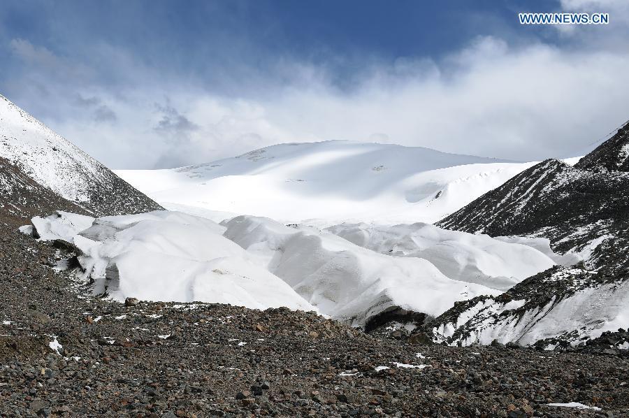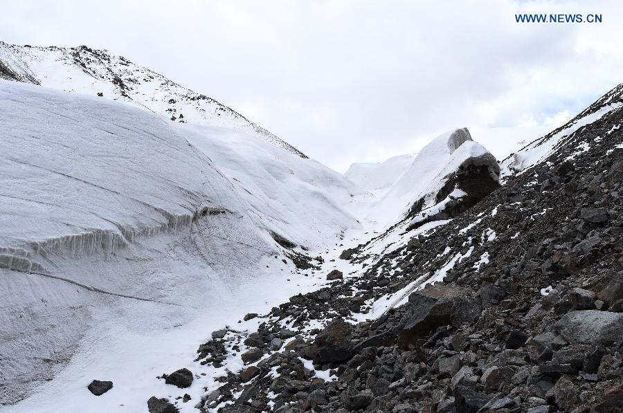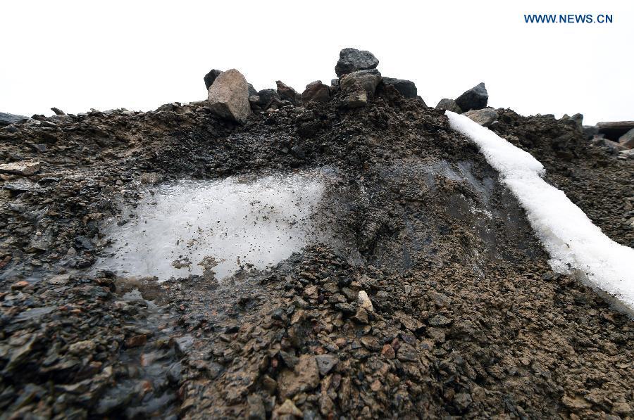 Photo taken on May 23, 2015 shows the shrinking Qiyi glacier in Qilian Mountains, northwest China's Gansu Province. Glaciers on Qilian Mountains have shrunk 36 square kilometers over the past 10 years, and the altitudes of terminal and snow line have risen on average 2-6.5 meters per year. (Xinhua/Fan Peishen)