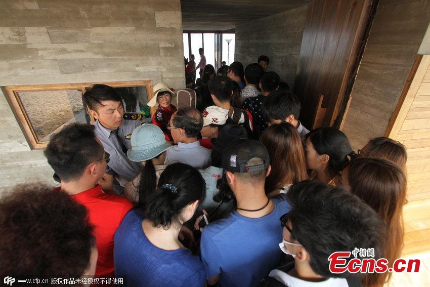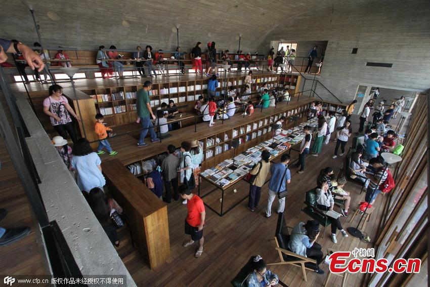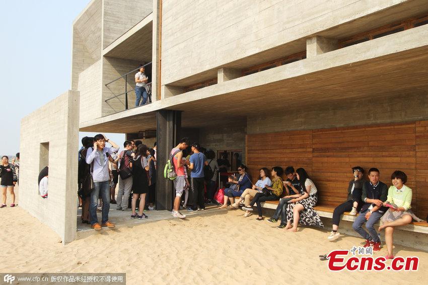 Visitors crowd an isolated library hundreds of meters away from a popular beach resort in Beidaihe, North China’s Hebei province, May 23, 2015. The two-storied library, built for public use, is also a nice place to watch the waves and tides. (Photo/CFP)