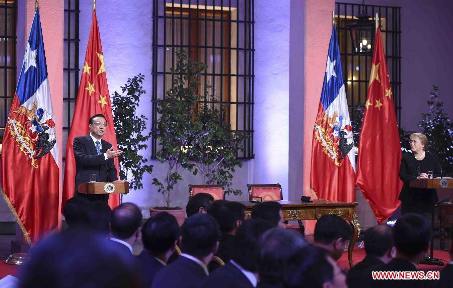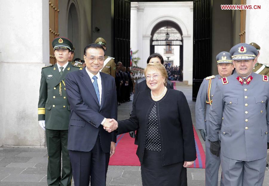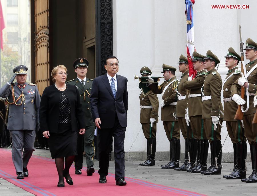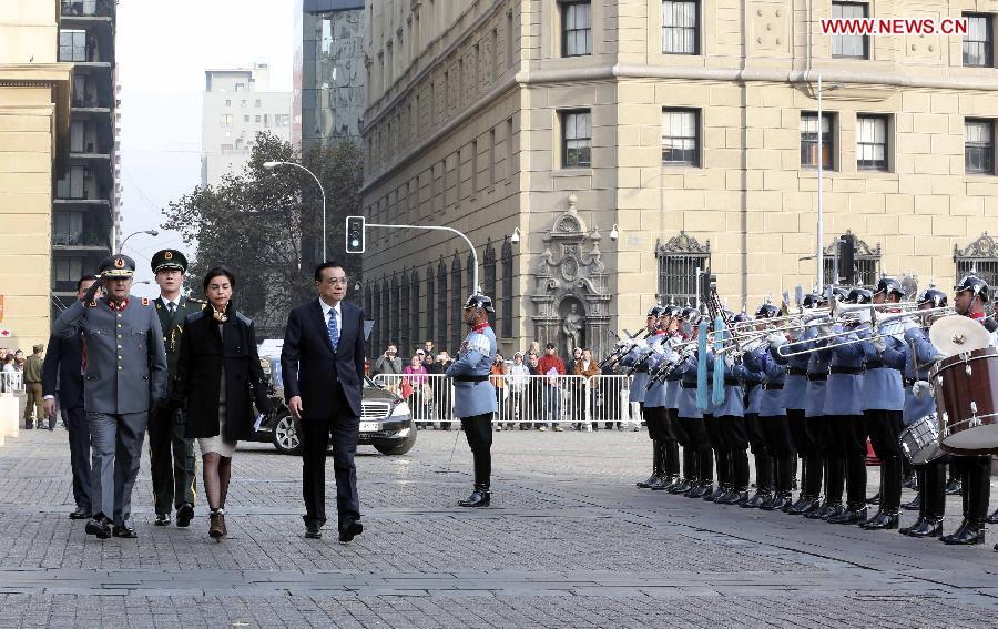 Chinese Premier Li Keqiang (3rd L front) attends a welcoming ceremony held by Chilean President Michelle Bachelet in Santiago, capital of Chile, May 25, 2015. (Photo: Xinhua/Ding Lin)