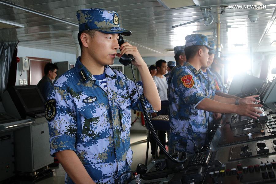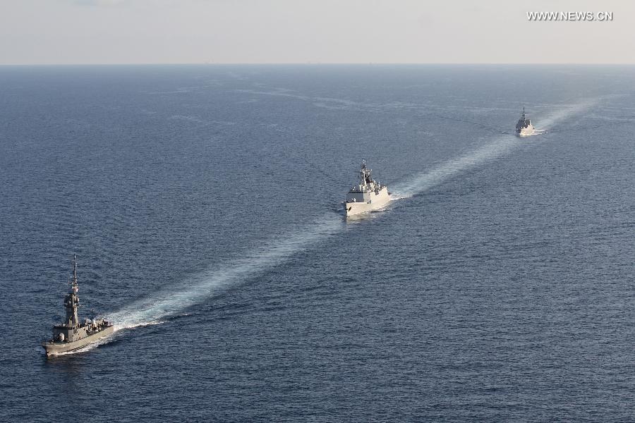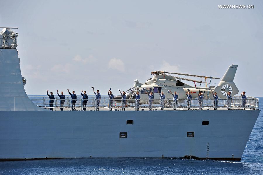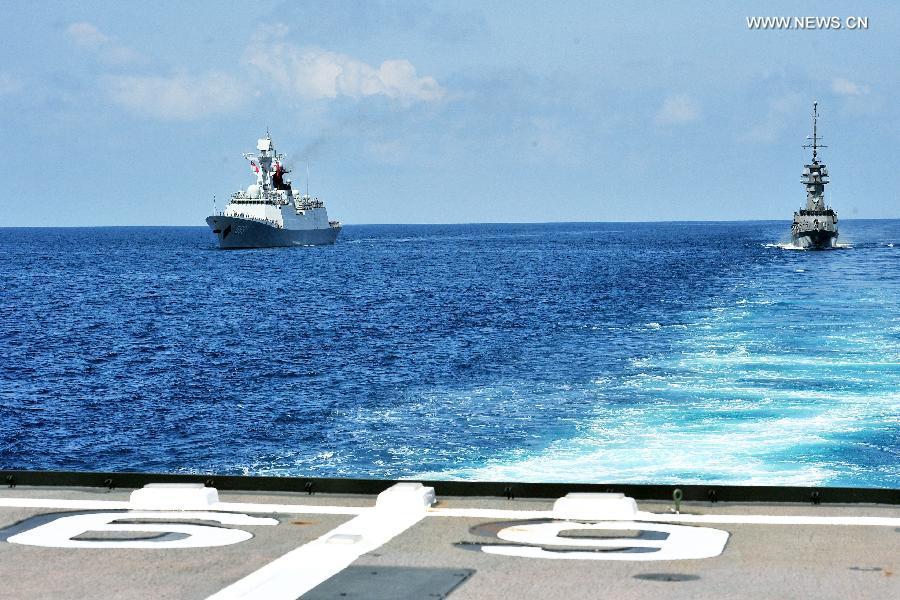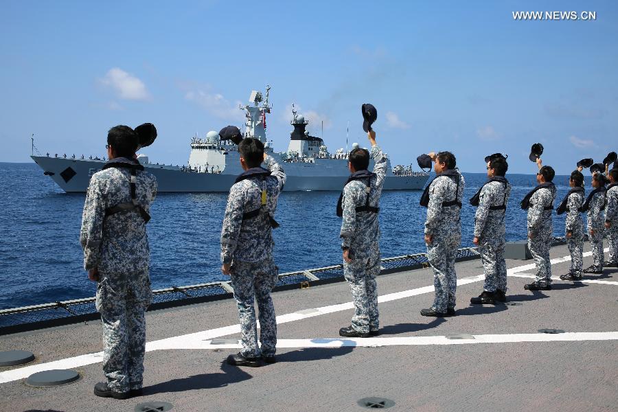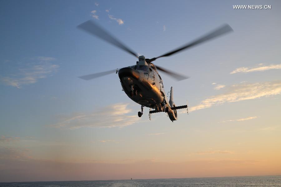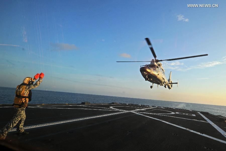 A Dolphin Z-9 helicopter of China's Navy missile frigate CNS Yulin flies off the deck of Singapore's Navy missile frigate RSS Intrepid during the "Exercise Maritime Cooperation 2015", May 25, 2015. The Singapore and Chinese navies on Monday concluded the inaugural Exercise Maritime Cooperation 2015. Chinese missile frigate Yulin, Singapore's Formidable-class frigate (RSS Intrepid) and Victory-class missile corvette (RSS Valiant) participated in the bilateral maritime exercise. (Photo: Xinhua/Then Chih Wey)