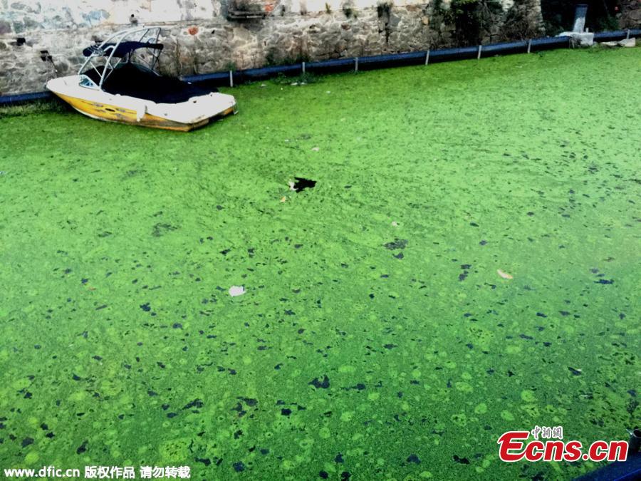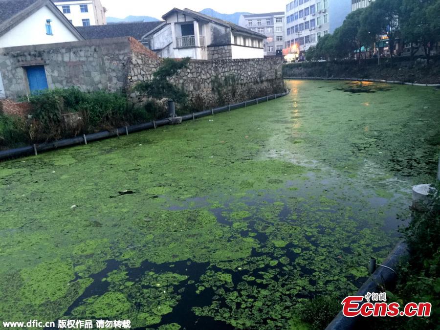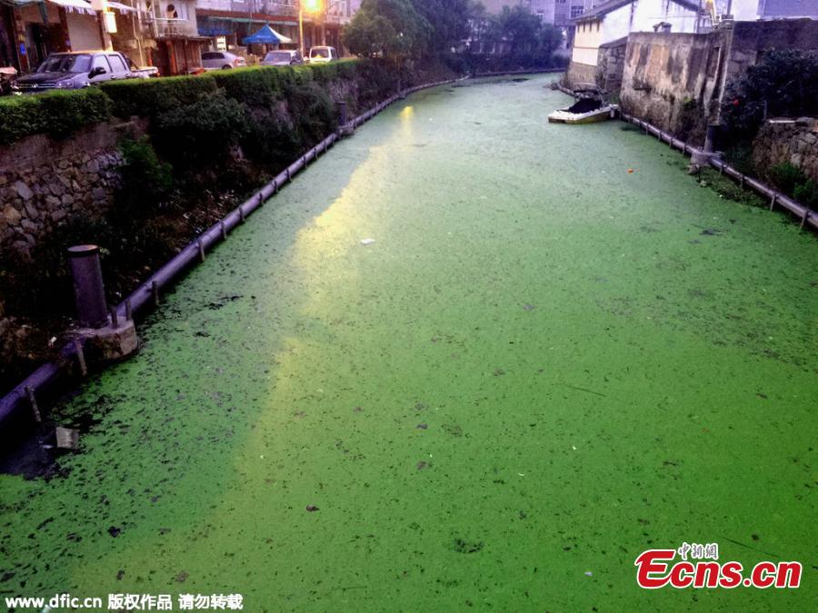 An algae bloom covers a 2km-section of a river in Wenling city, East China’s Zhejiang province, May 26, 2015. (Photo/IC)