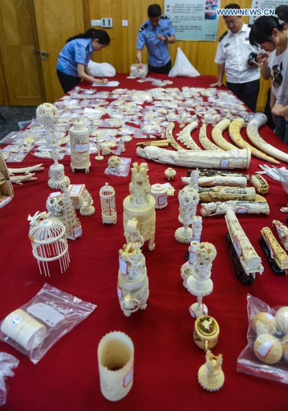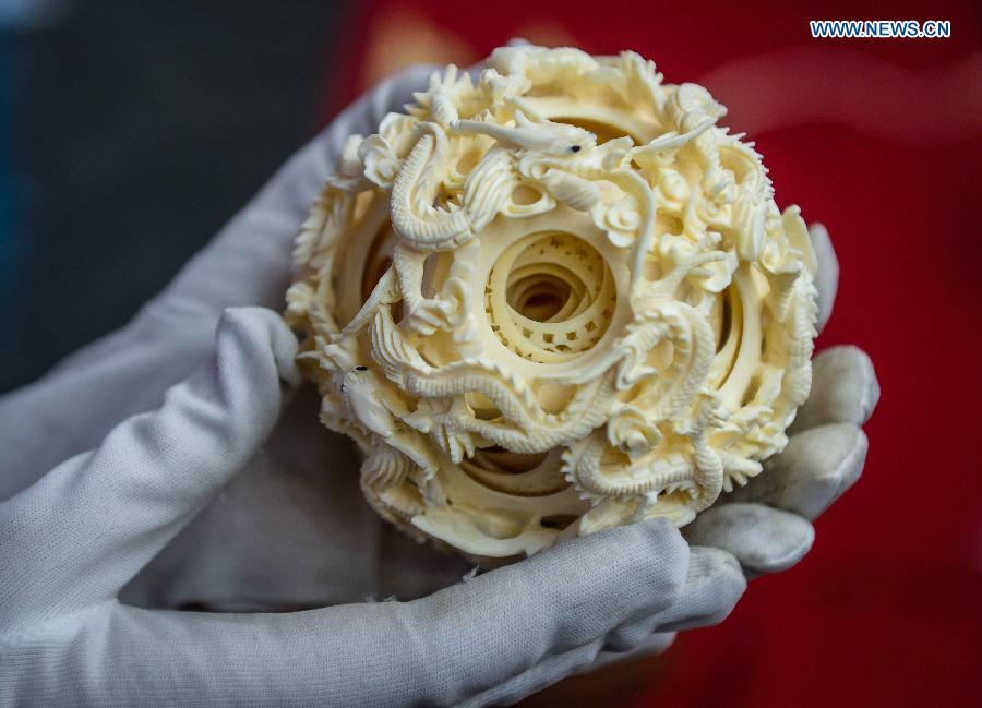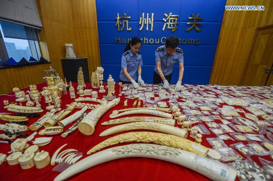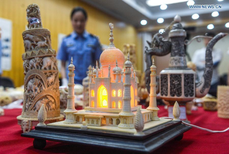 Photo taken on May 18, 2015 shows smuggled artworks made of ivory seized by members of Hangzhou Customs, in Hangzhou, east China's Zhejiang Province. Hangzhou Customs announced Thursday that they have seized over 270 kilograms smuggled ivory and about 9 kilograms rhino horn since June last year. (Photo: Xinhua/Xu Yu)