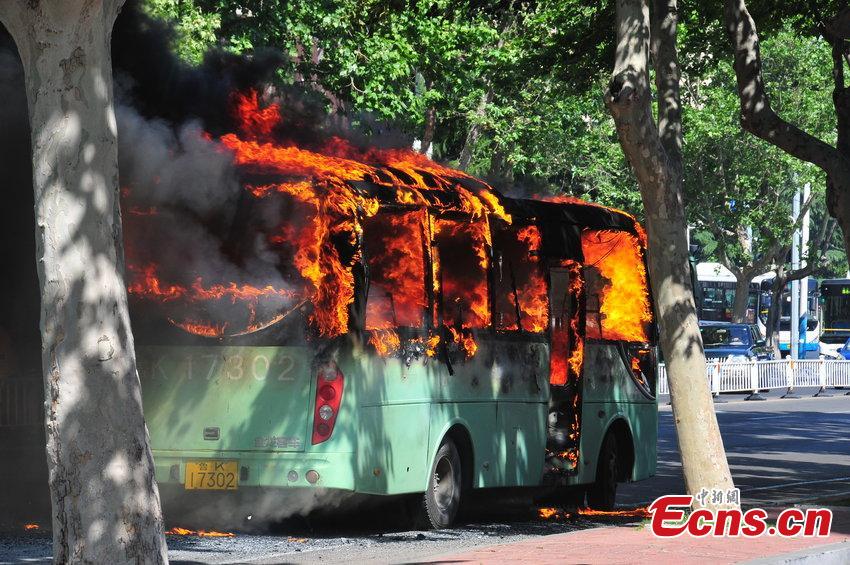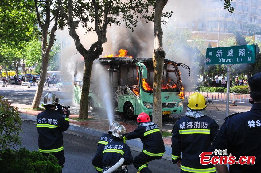 A public bus catches fire in Weihai city of East China's Shandong province on Thursday, May 28, 2015. The cause of the fire is under investigation. (Photo/CFP)