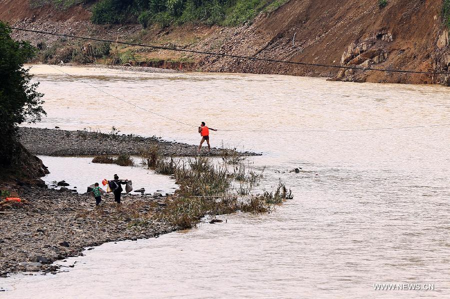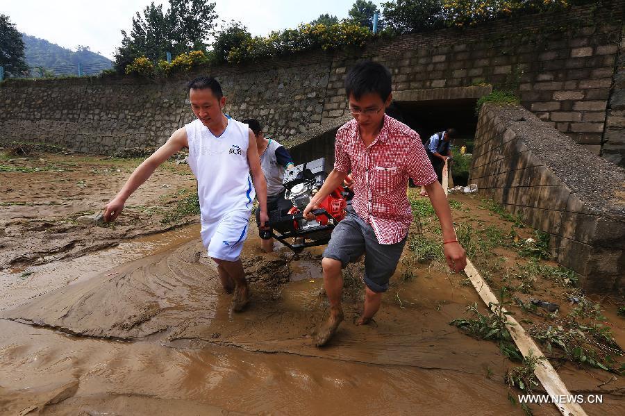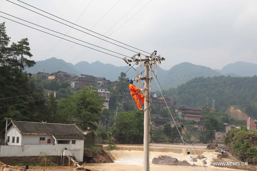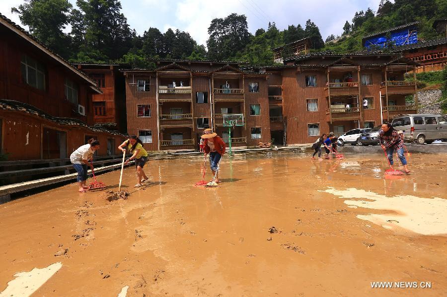 Villagers clean yards after rainstorms in Leishan County, southwest China's Guizhou Province, May 28, 2015. Leishan County lost access to power and water supplies after torrential rain battered the area from Tuesday night to Wednesday. The rescue work is underway. (Photo: Xinhua/Wu Jibin)