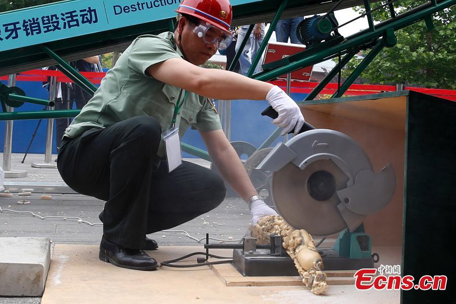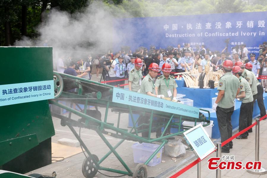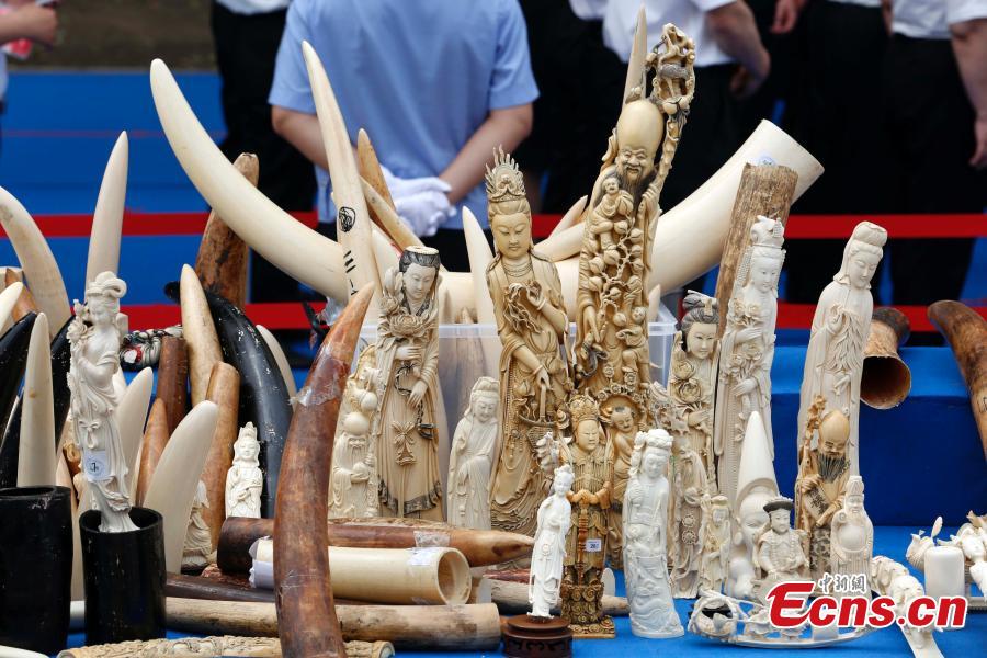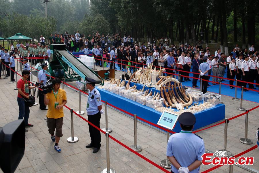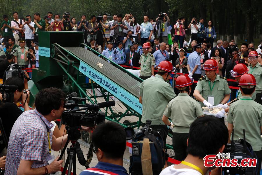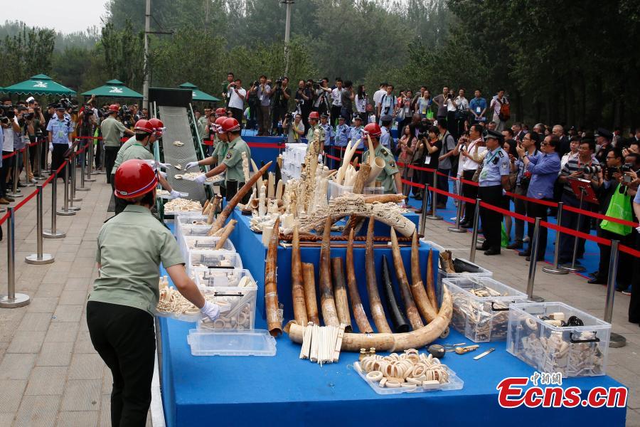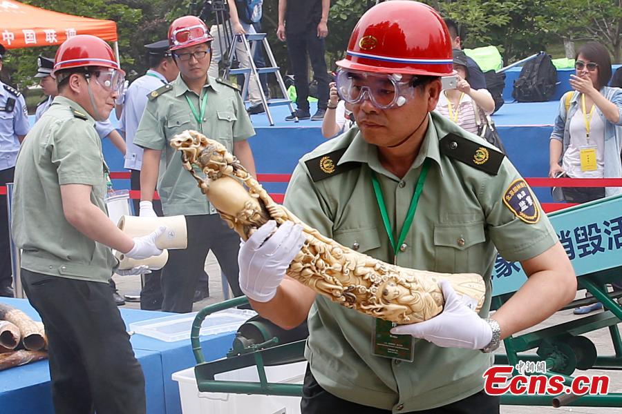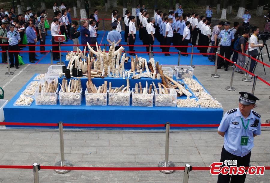 Confiscated ivory products are seen before being destroyed in Beijing, May 29, 2015. Officers from the State Forestry Administration and the General Administration of Customs destroyed 6.62 tonnes of illegal ivory items seized in 2014, ranging from elephant tusks to smaller carved ivory items. China has vowed to continue fighting against illegal wildlife trade. (Photo: China News Service/Han Haidan)