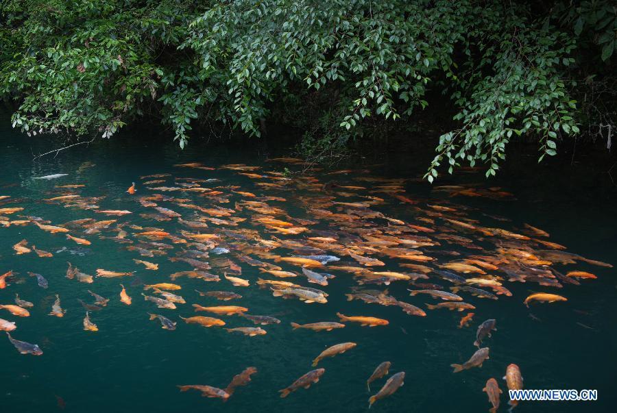 Photo taken on May 30, 2015 shows a school of fish swimming in a stream by Qianfo Mountain in Shilian Town of Suichang County, east China's Zhejiang Province. (Xinhua/Li Suren)