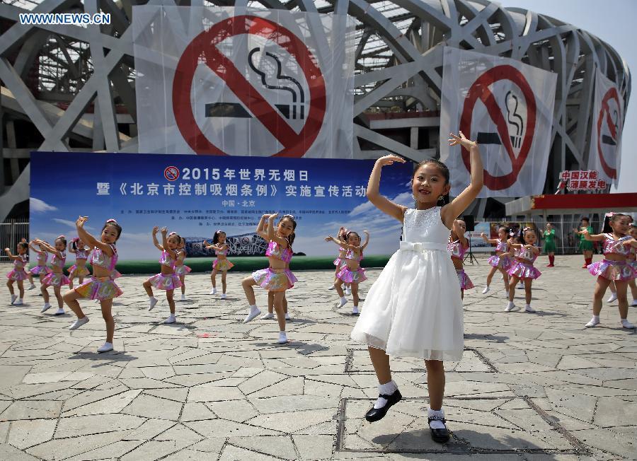 Children dance in front of anti-smoking banners displayed on the iconic Bird's Nest National Stadium during an event marking World No Tobacco Day in Beijing, capital of China, May 31, 2015. Beijing plans to introduce new regulations on June 1 requiring all indoor public places - and many outdoor public places - to be 100% smoke-free. The legislation is seen as the most rigorous anti-smoking law in China's history. (Photo: Xinhua/Shen Bohan)