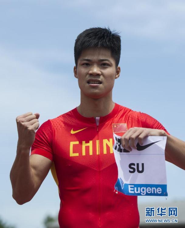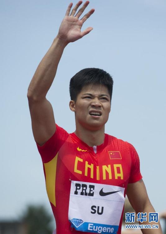 Su Bingtian (R) competes during the men's 100 meters at a Diamond League event in the United States on Saturday, May 30, 2015. Su has come in third with a run of 9.99 seconds in the men's 100 meters at a Diamond League event in the United States. The 24-year-old is now the first from Asia to break the 10 second barrier in the 100-meters.(Photo/Xinhua)