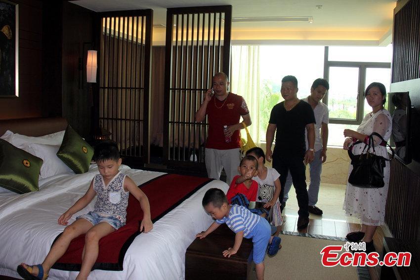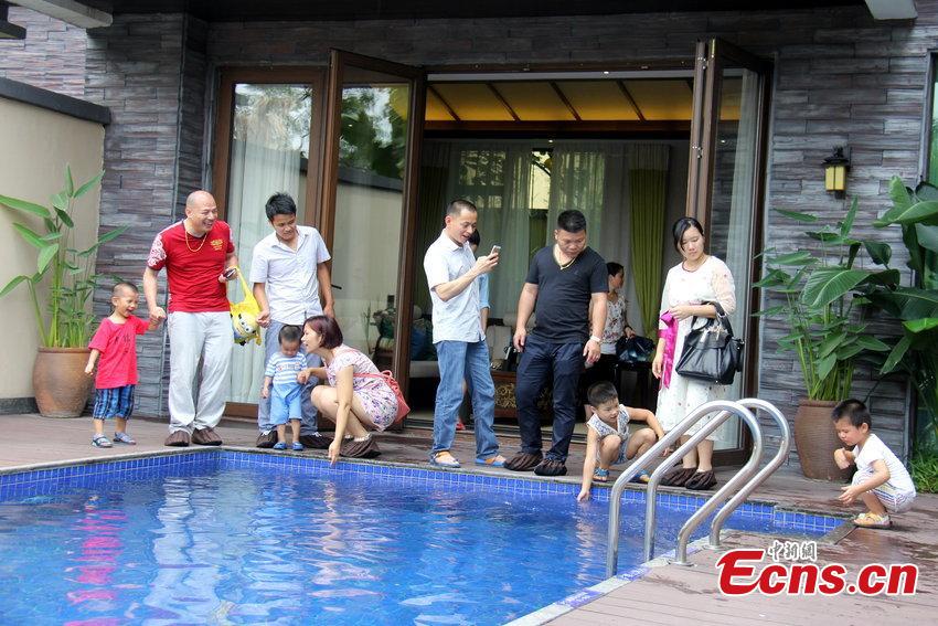Parents and children walk through two-storied buildings, admiring swimming pools and lingering on walkways flanked with greenery during their visit to a luxurious villa in Qingyuan, South China's Guangdong province on May 31, 2015. More than 300 parents brought their children to a four-million-yuan luxury villa in Qingyuan, in the weekend before Children's Day. The purpose of the trip was to inspire their children to become rich and successful in the future. (Photo/CFP)