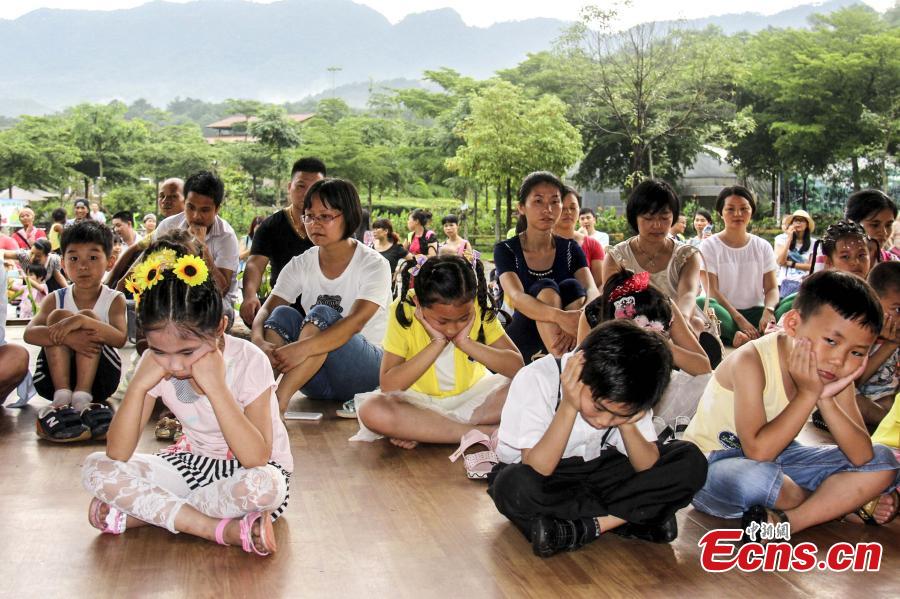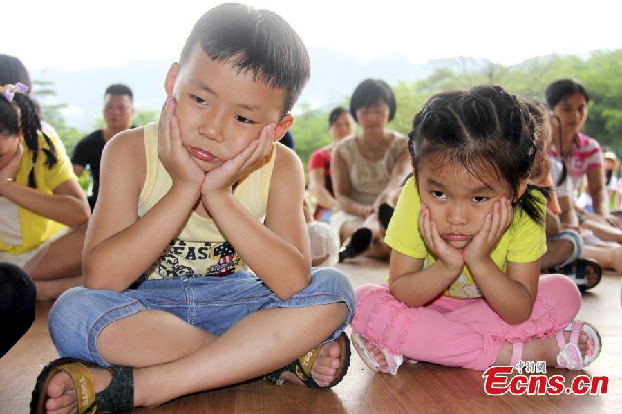 A girl tires to interrupt participants in a “blank-staring contest” in Qingyuan city, South China’s Guangdong province, May 31, 2015. Some 100 participants, aged from six to over 60, battled to pull off the most spaced-out facial expression in their preferred positions. The top three winners were all children, with the champion holding a vacant look for about one hour. (Photo: China News Service/Liang Yongqiang)