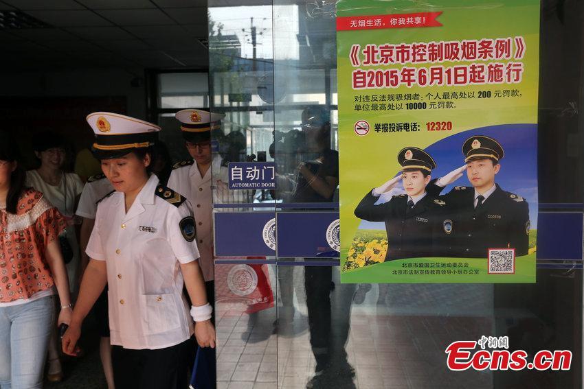 Law enforcement personnel issue a notice of correction to Haidilao hot pot restaurant in Beijing, June 1, 2015. The restaurant was the first to be reprimanded for not fully complying with Beijing’s strict new anti-smoking rules that came into effect June 1. Over 1,000 law enforcement personnel will visit places like hospitals, schools, hotels, and restaurants to ensure the new rules are implemented. (Photo/CFP)