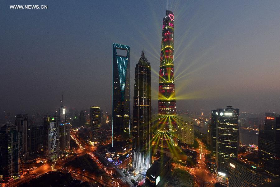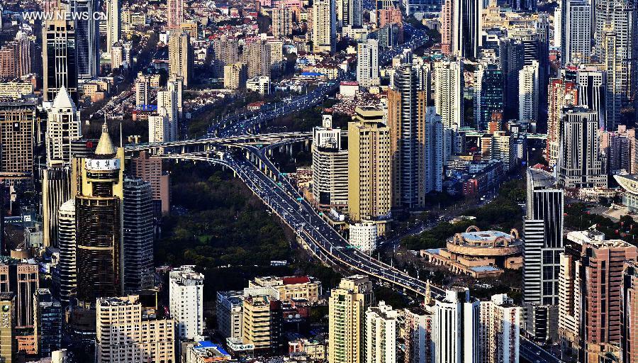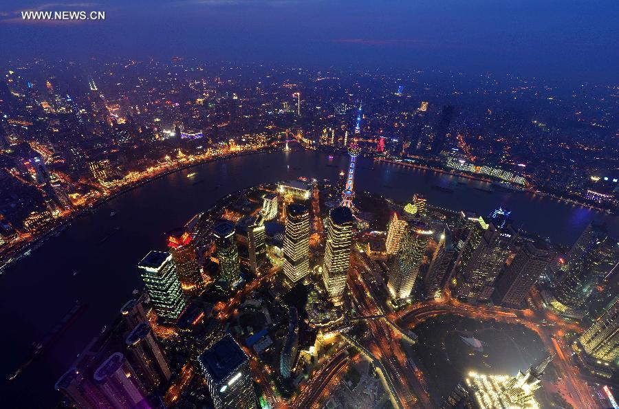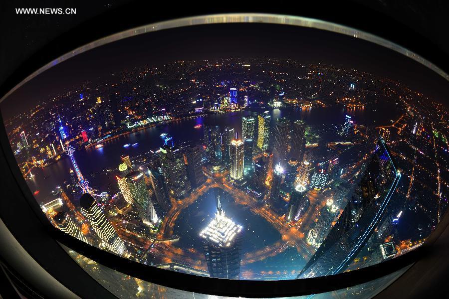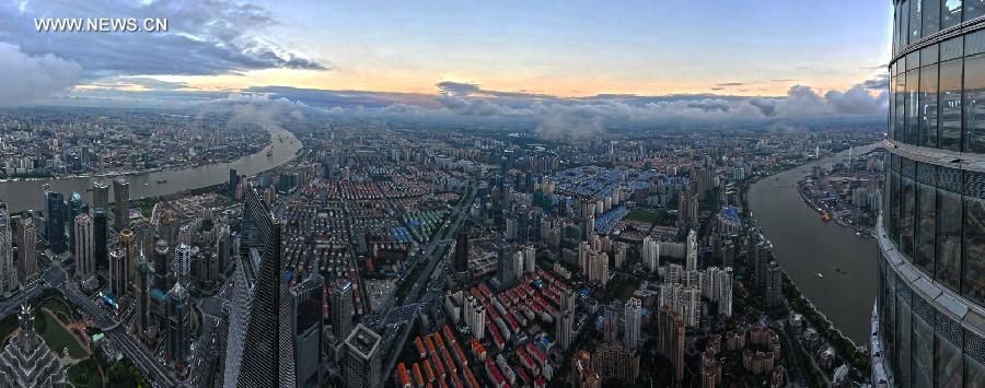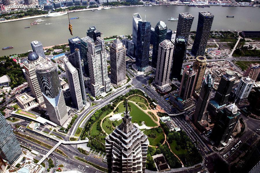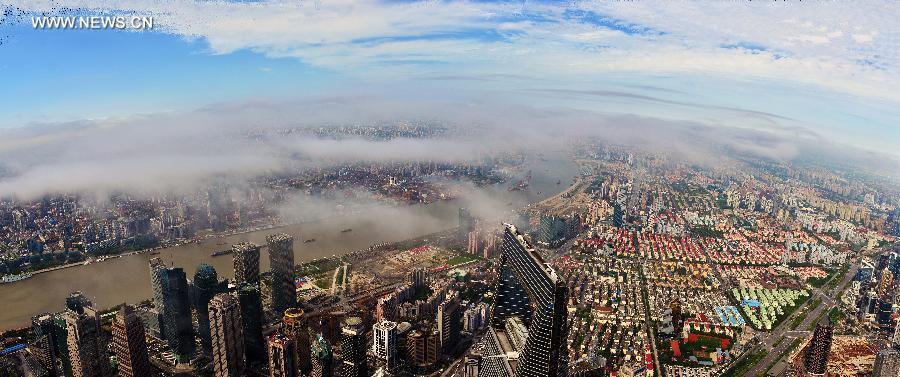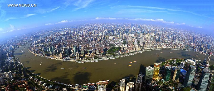 Photo taken from Shanghai Tower on Sept. 2, 2013 shows a view of downtown Shanghai, east China. Shanghai Tower, a megamall skyscraper under construction, stands approximately 632 meters high and has 128 stories, with a total floor area of 380,000 square meters. It's projected to open to the public in mid-2015. (Xinhua/Huang Weiguo)