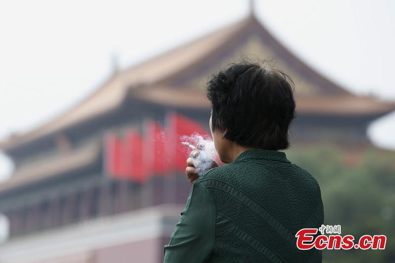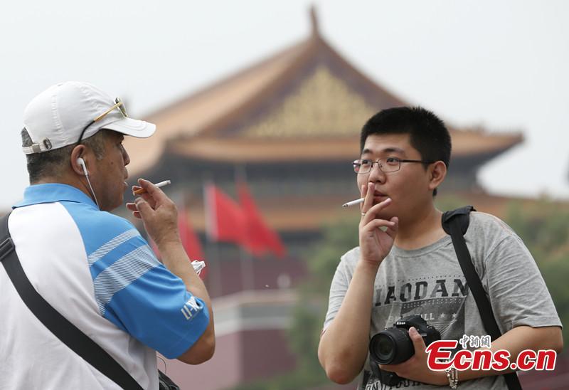 People smoke at Tiananmen Square in Beijing, capital of China, June 1, 2015. A new smoking ban took effect in Beijing on June 1. The new ban, the country's toughest to date, prohibits smoking in all the city's indoor public places, workplaces, and on public transportation. (CNS photo/Liu Guanguan)