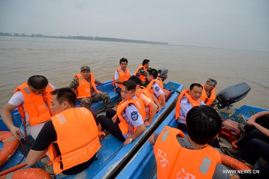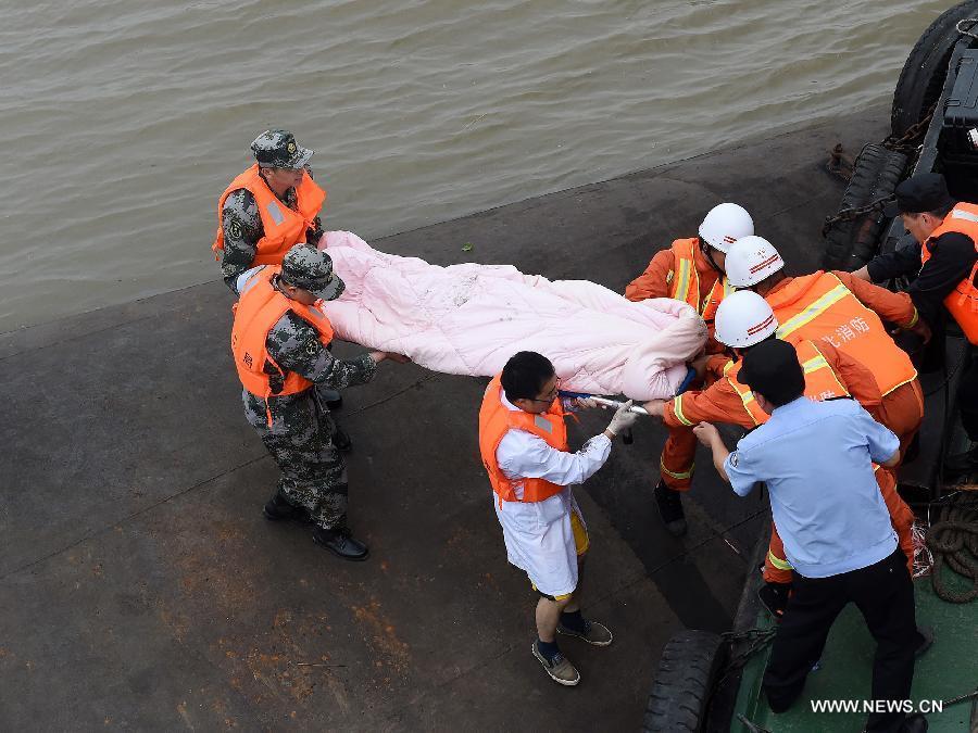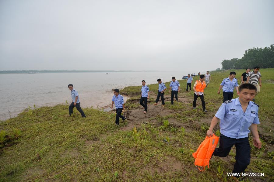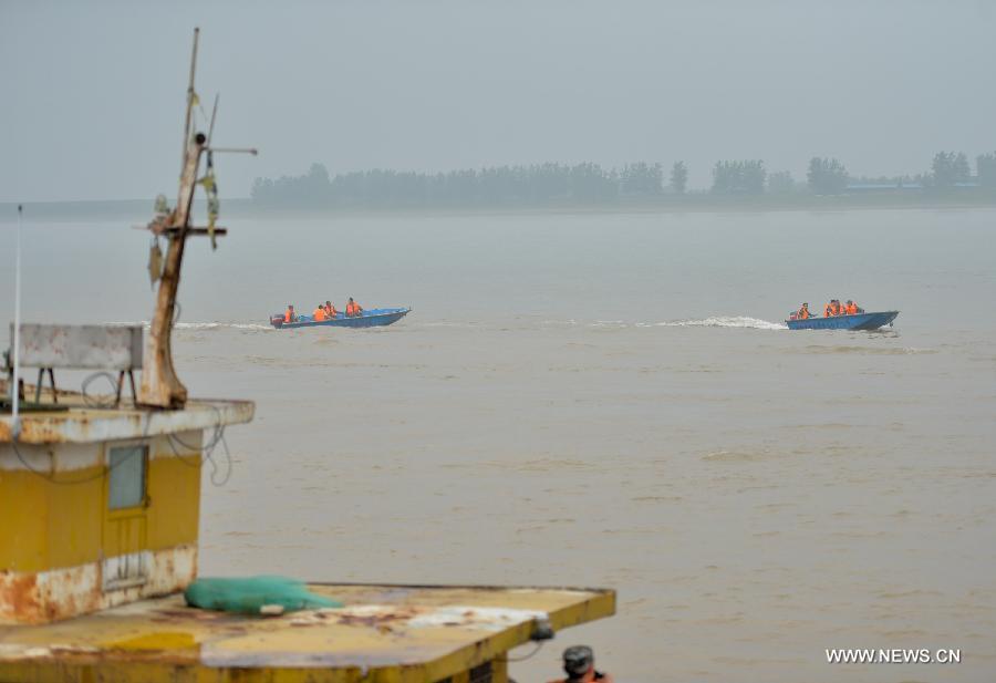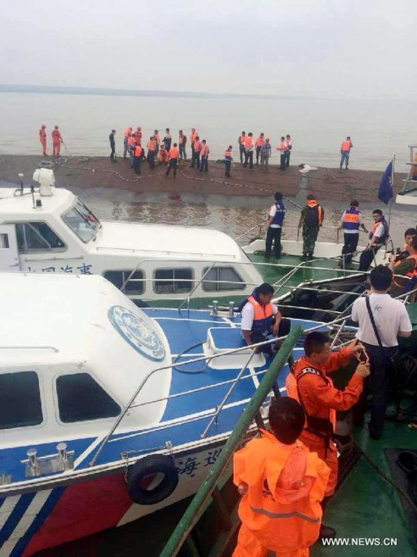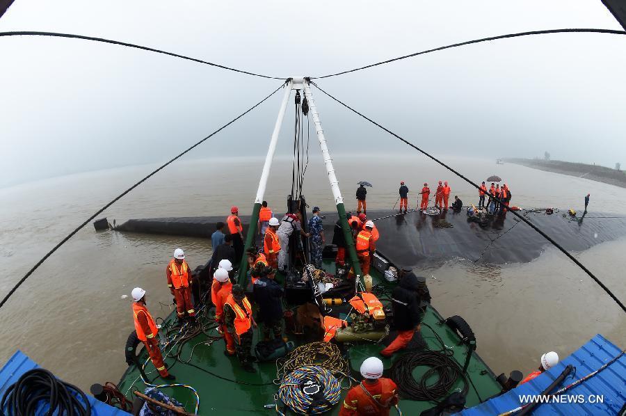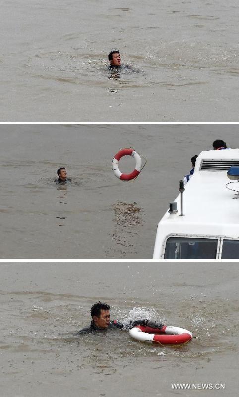 Combo photo shows a rescuer swimming back to the rescue ship for backup after finding suviviors at the overturned passenger ship in the Jianli section of the Yangtze River in central China's Hubei Province, June 2, 2015. The ship, named Dongfangzhixing, or Eastern Star, sank at around 9:28 p.m. (1328 GMT) on Monday after being caught in a cyclone in the Jianli section of the Yangtze River. Carrying 406 passengers, five travel agency workers and 47 crew members, the ship was heading from Nanjing, capital of east China's Jiangsu Province, for southwest China's Chongqing Municipality. (Xinhua/Xiao Yijiu)