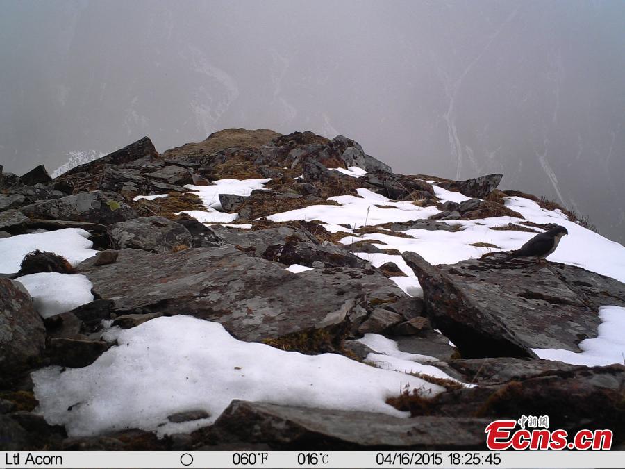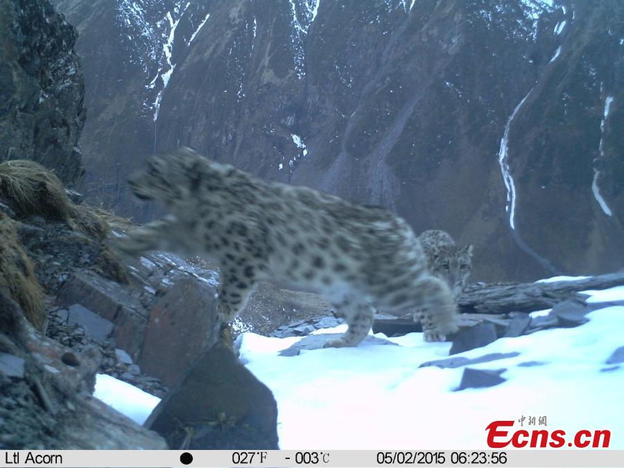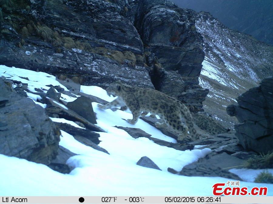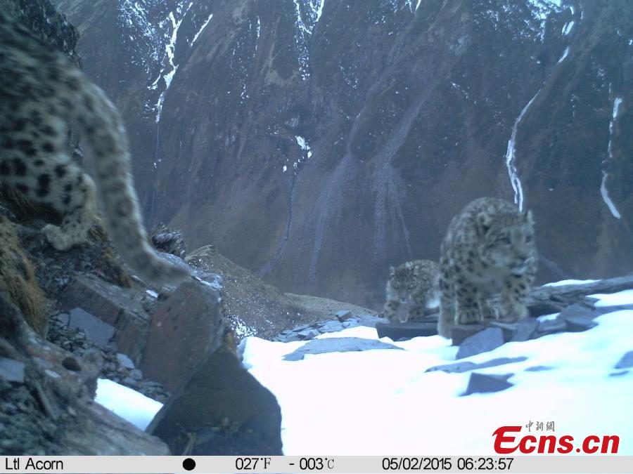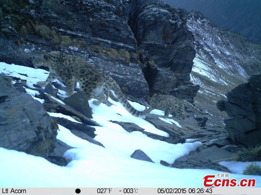An image captured by an infrared camera shows a wild snow leopard hunting with her two cubs on a mountain in the Wolong National Nature Reserve in Southwest China’s Sichuan province, June 2, 2015. (Photo provided to China News Service)