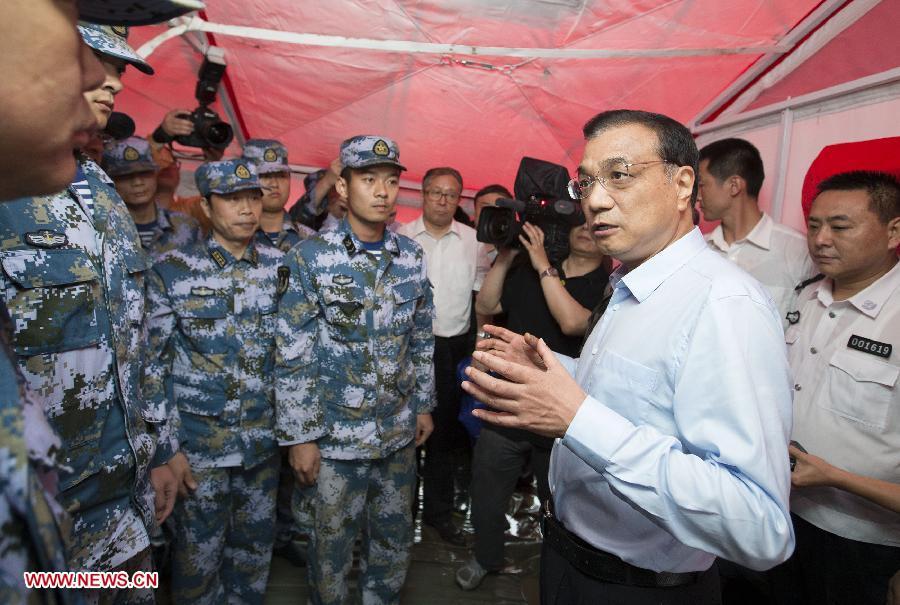 Chinese Premier Li Keqiang (R Front) visits divers searching for survivors at the site of overturned ship in the Jianli section of the Yangtze River in central China's Hubei Province, June 3, 2015. Ship Dongfangzhixing, or Eastern Star, sank Monday night in the Yangtze River. Carrying 405 passengers, five travel agency workers and 47 crew members, the ship was heading from Nanjing, capital of east China's Jiangsu Province, for southwest China's Chongqing Municipality. (Photo: Xinhua/Huang Jingwen)