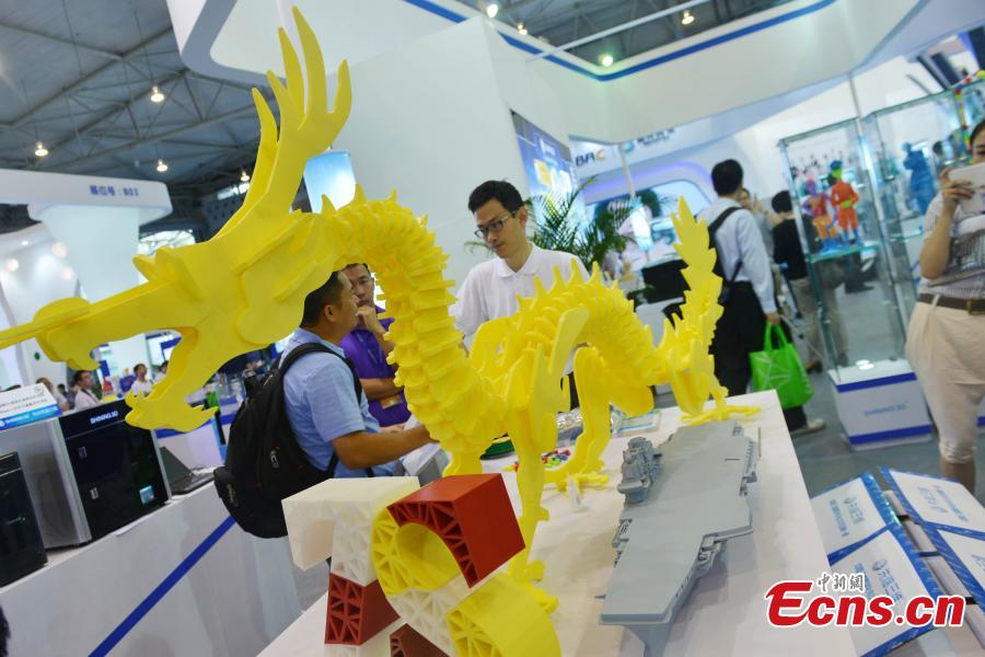 Visitors examine a dragon sculpture made using 3D printing technology at the 2015 World 3D Printing Technology Industry Conference and Expo in Chengdu, capital of South China’s Sichuan province, June 3, 2015. More than 100 companies presented their latest products and services during the three-day event. (Photo: China News Service/Zhang Lang)