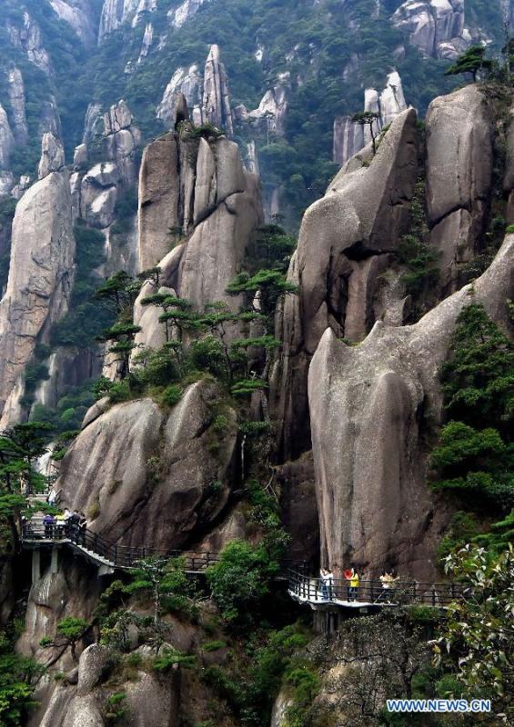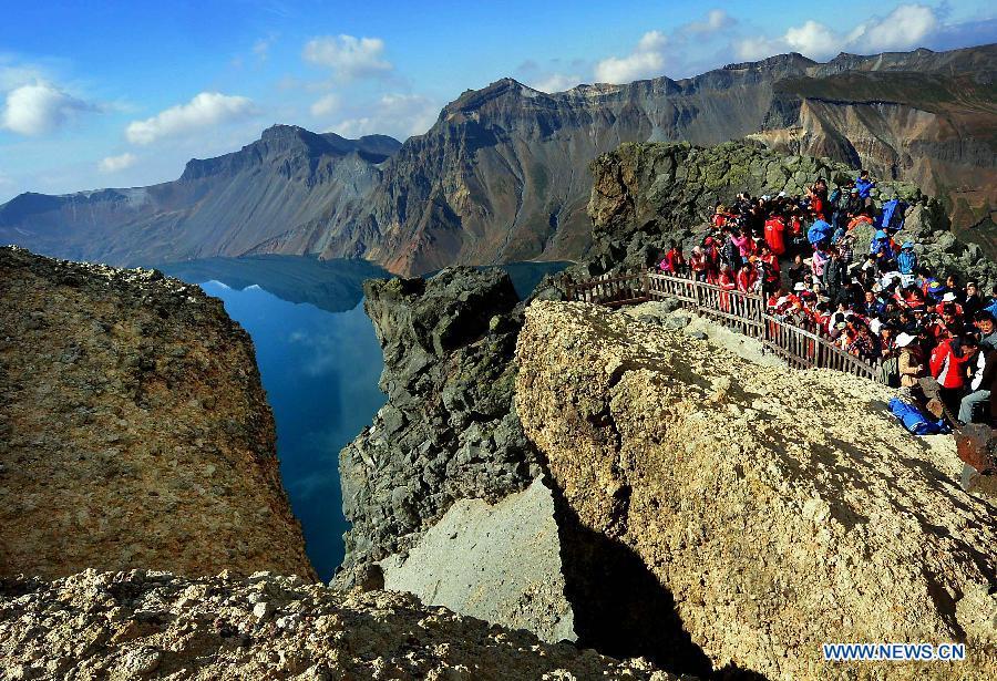 Tourists gather to watch the Tianchi Lake on the top of the Changbai Mountain Nature Reserve in northeast China's Jilin Province, Sept. 30, 2013. As a large and geographically diverse country, China attracts tourists and explorers for its significant geomorphic features and exceptional beauty. (Photo: Xinhua/Wang Song)