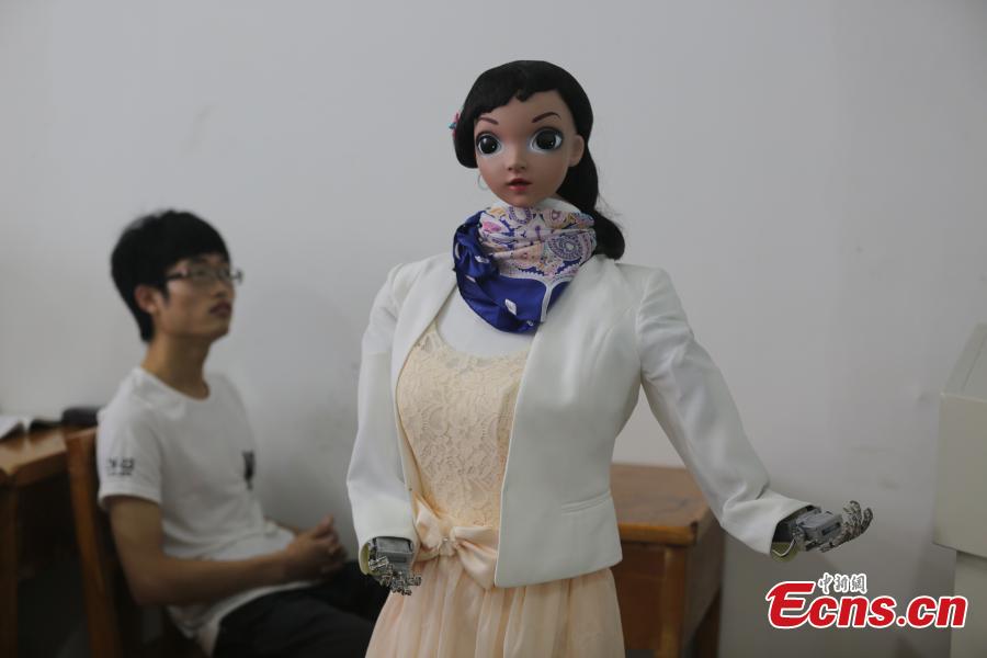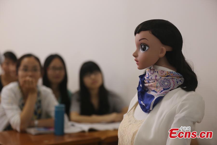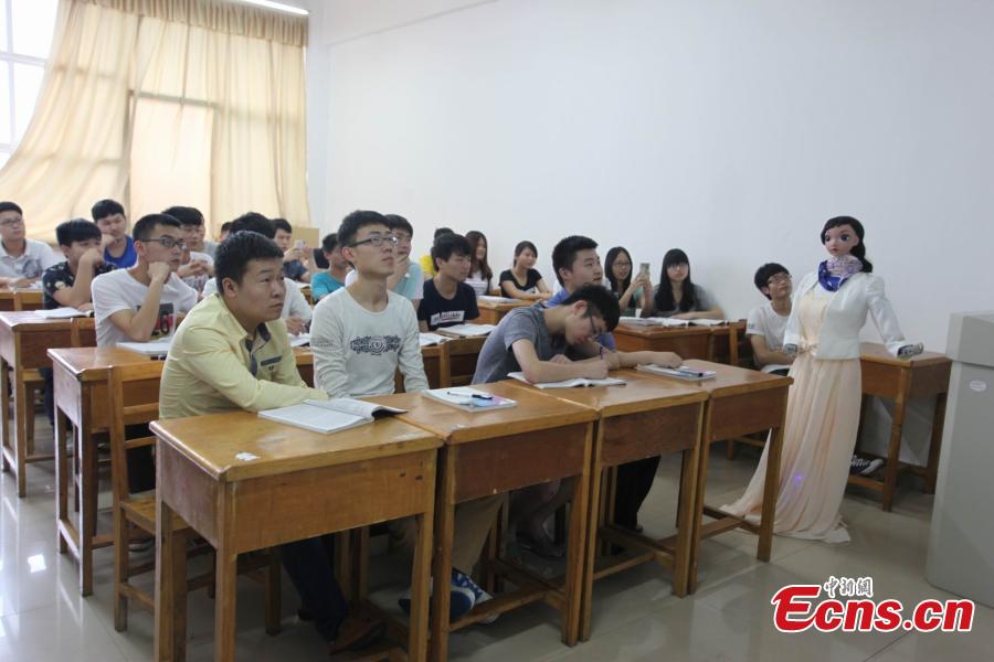 A robot teaches in a classroom at Jiujiang University in Jiujiang city, East China’s Jiangxi province, June 3, 2015. Zhang Guangshun, head of the robotics research team, said the robot can give Power Point-assisted presentations and conduct basic interactions with students. Zhang said his team will upgrade the robot, named Xiao Mei or Little Beauty, to apply it to more fields. (Photo: China News Service/Wei Dongsheng)