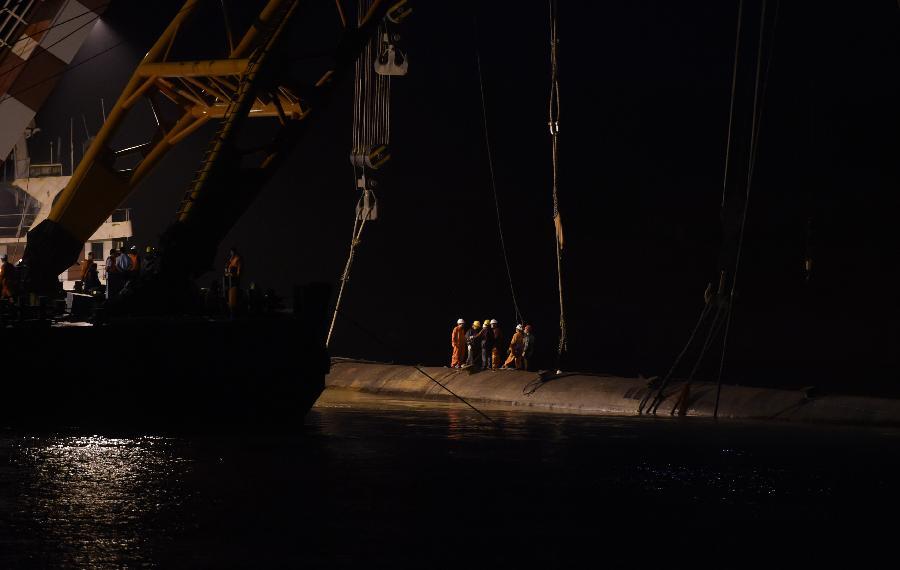 The photo taken by a cell phone shows the search and rescue team starting to right the capsized cruise ship Eastern Star in the section of Jianli on the Yangtze River, central China's Hubei Province, June 4, 2015. The ship will be hoisted by cranes on site capable of lifting the whole vessel and set it upright. Over 450 people were on board the Eastern Star when it sank on Monday night in Jianli. (Photo: Xinhua/Wu Wanhang)
