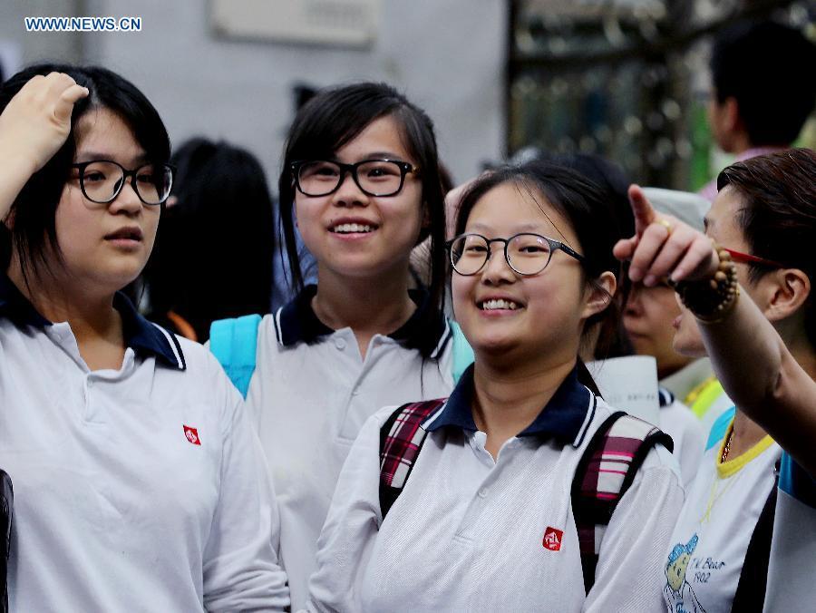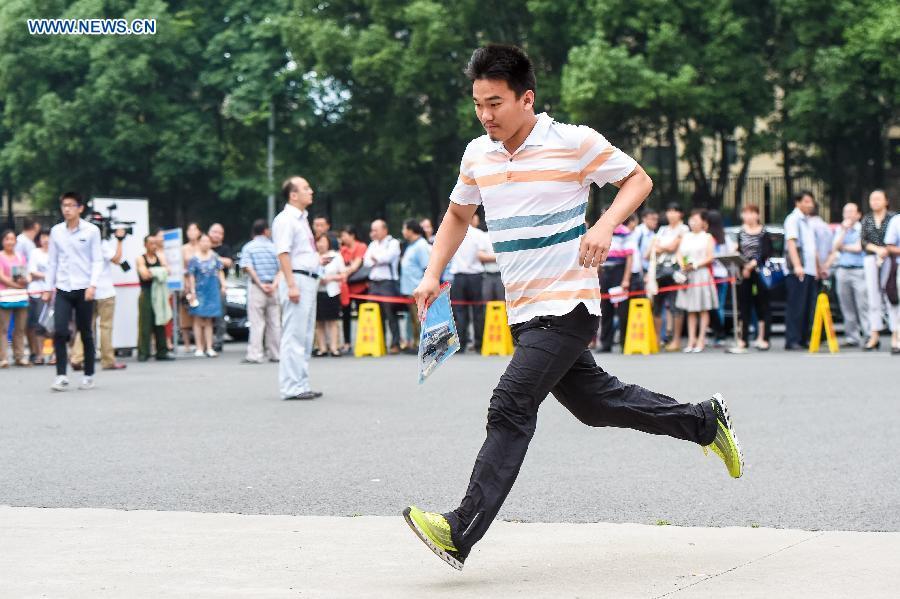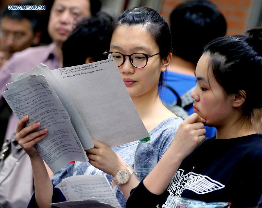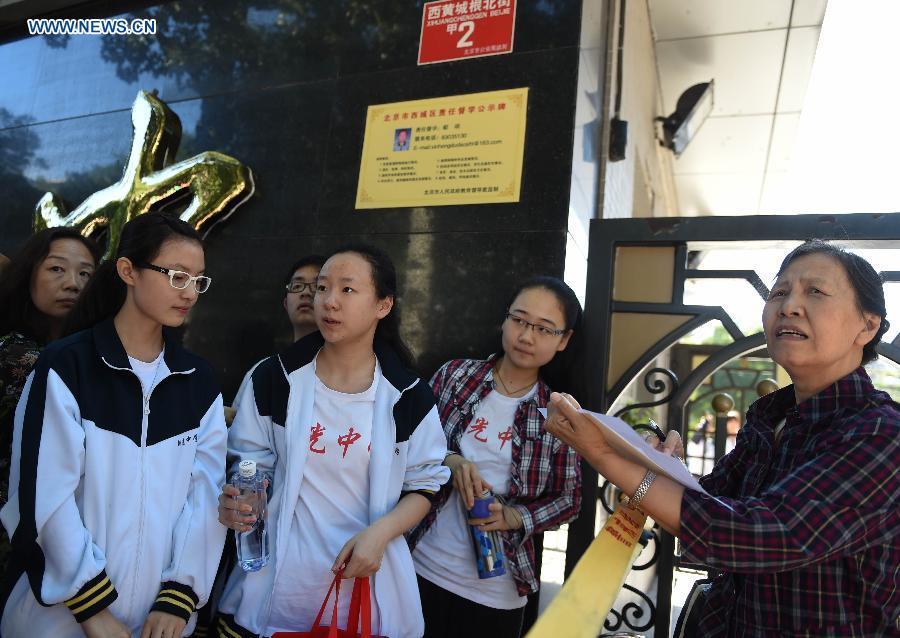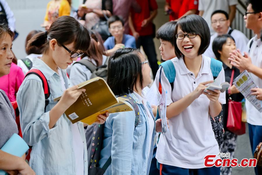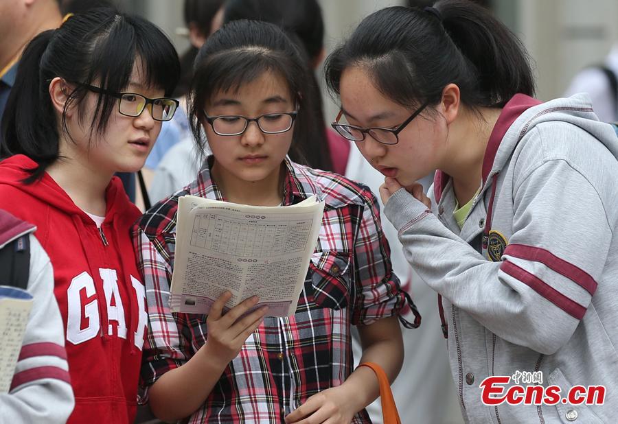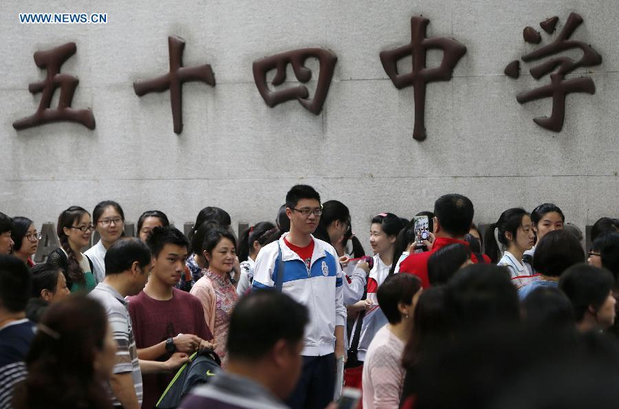 Candidates wait to enter No. 3 High School for the national college entrance exams in Fuzhou, Fujian province, June 7, 2015. The two-day exams began on Sunday, with 9.42 million people sitting for the exams this year. Thirteen provincial-level regions will also arrange exams for additional subjects on June 9. (Photo: China News Service/Li Nanxuan)